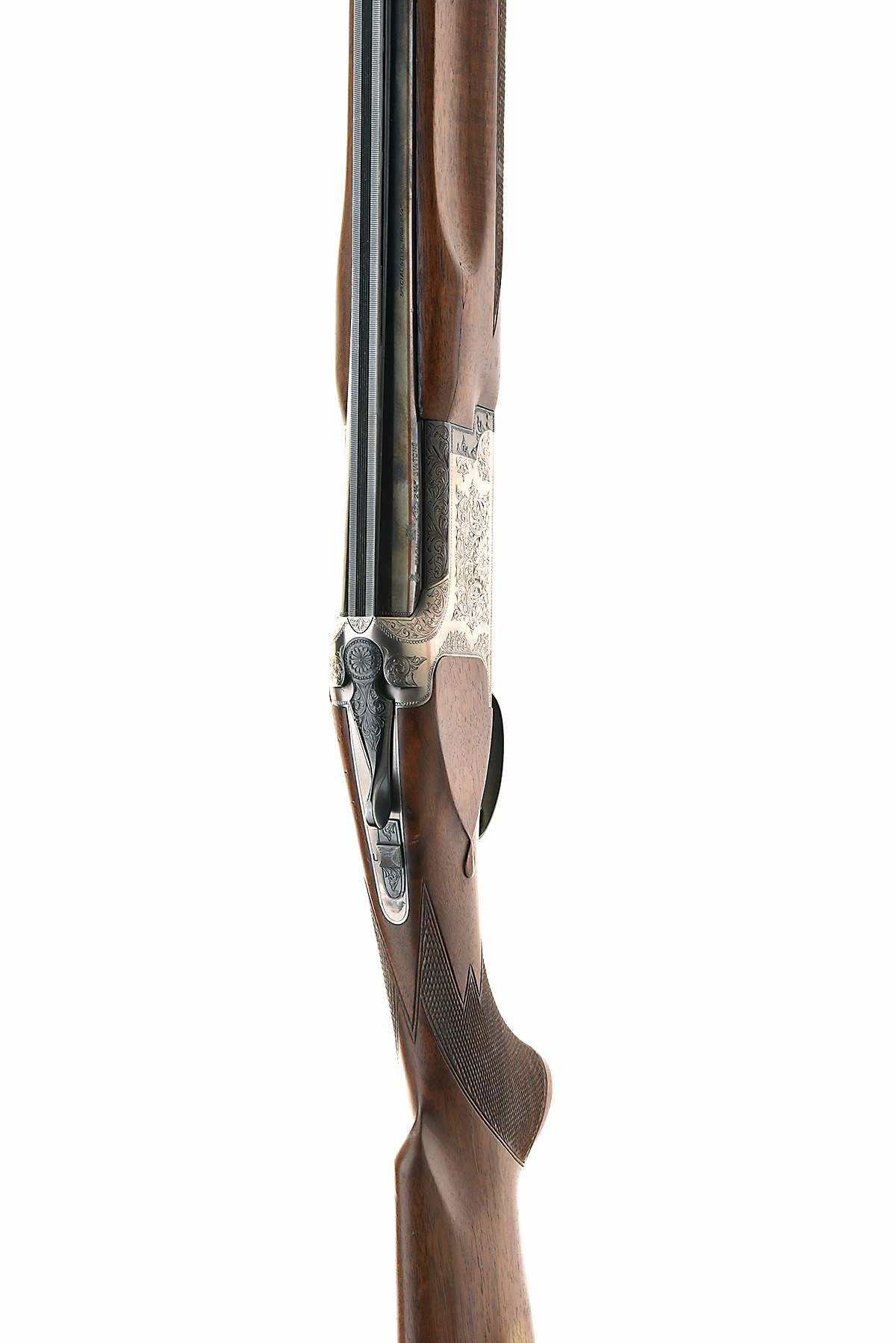 MIROKU FIREARMS MFG. CO. 12-BORE SINGLE-TRIGGER OVER AND UNDER EJECTOR, serial no. 80294PZ, dated 1981, 28in. nitro barrels with 10mm ventilated matt top-rib, 2 3/4in. chambers, bored approx. true cyl. in both, hold-open toplever, manual safety with integral barrel selector switch, gold-washed single trigger, beaded border and acanthus scroll engraving, bright finish, 14 1/4in. pistolgrip stock including buttplate, weight 7lb. 11oz.