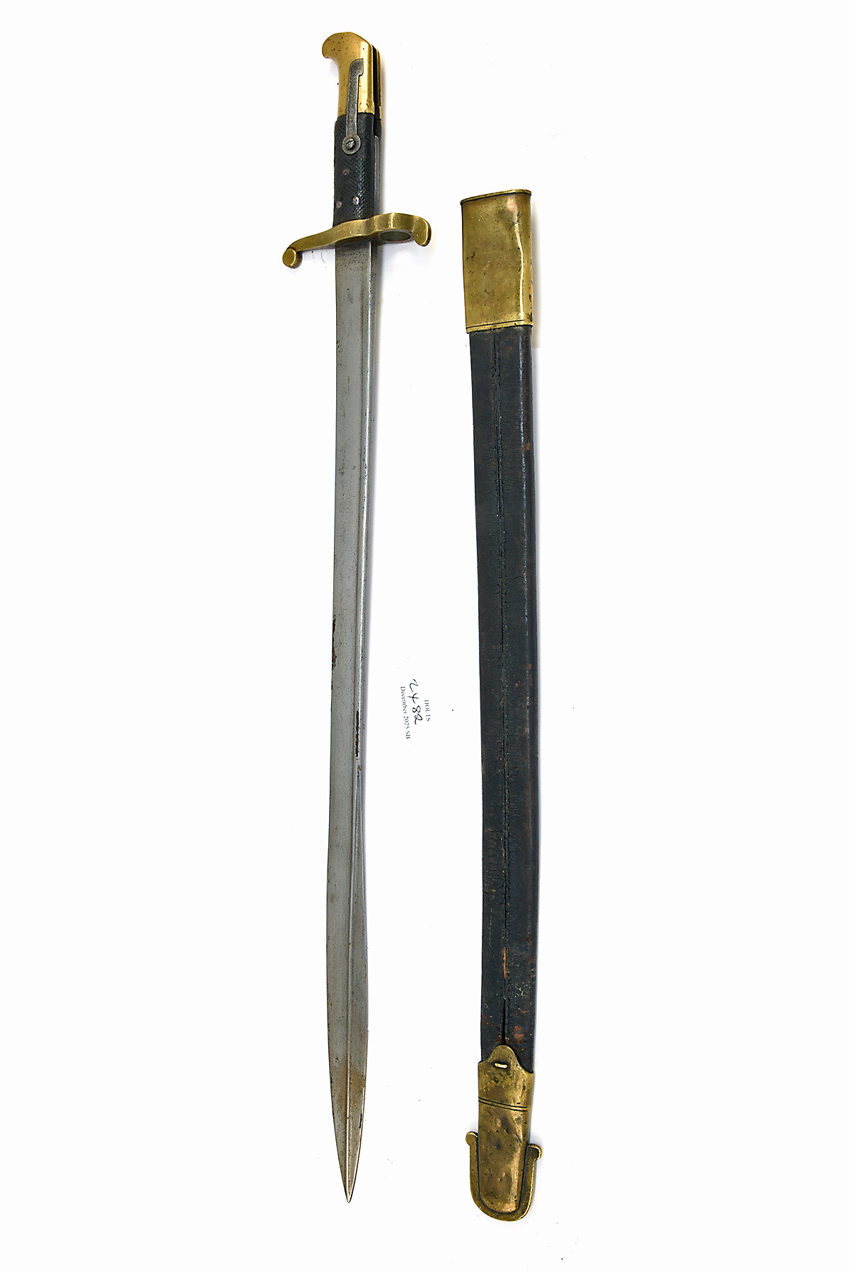A PATTERN 1855 SAPPERS AND MINERS "LANCASTER" BAYONET, circa late 1850s, with 24 in. pipe-backed blade, brass cross-guard and pommel, black pressed leather grips, black leather scabbard with brass furniture, worn, scabbard fittings dented and loose, stitching split