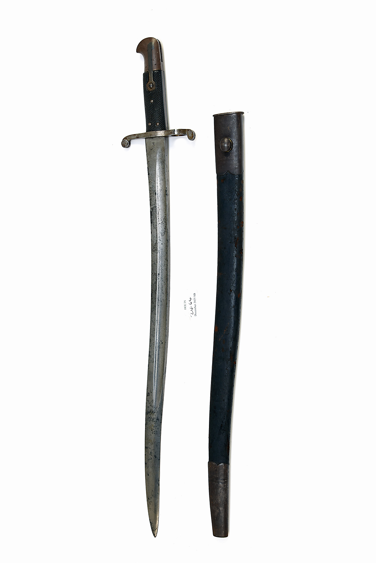 A SCARCE PATTERN 1863 YATAGHAN SWORD BAYONET FOR THE WHITWORTH RIFLE, circa 1864, with 22 3/4 in. single-edged blade fullered on each side, ricasso with crown above 'V. R', with Enfield inspection mark over, further inspection mark and 'H' on blade back, steel cross-guard, black pressed leather chequered grips, further inspection mark to hilt back, bird's head pommel with circular mortise, with it's black leather scabbard with steel fittings, some staining to blade, scabbard grazed, back of locket with shallow denting