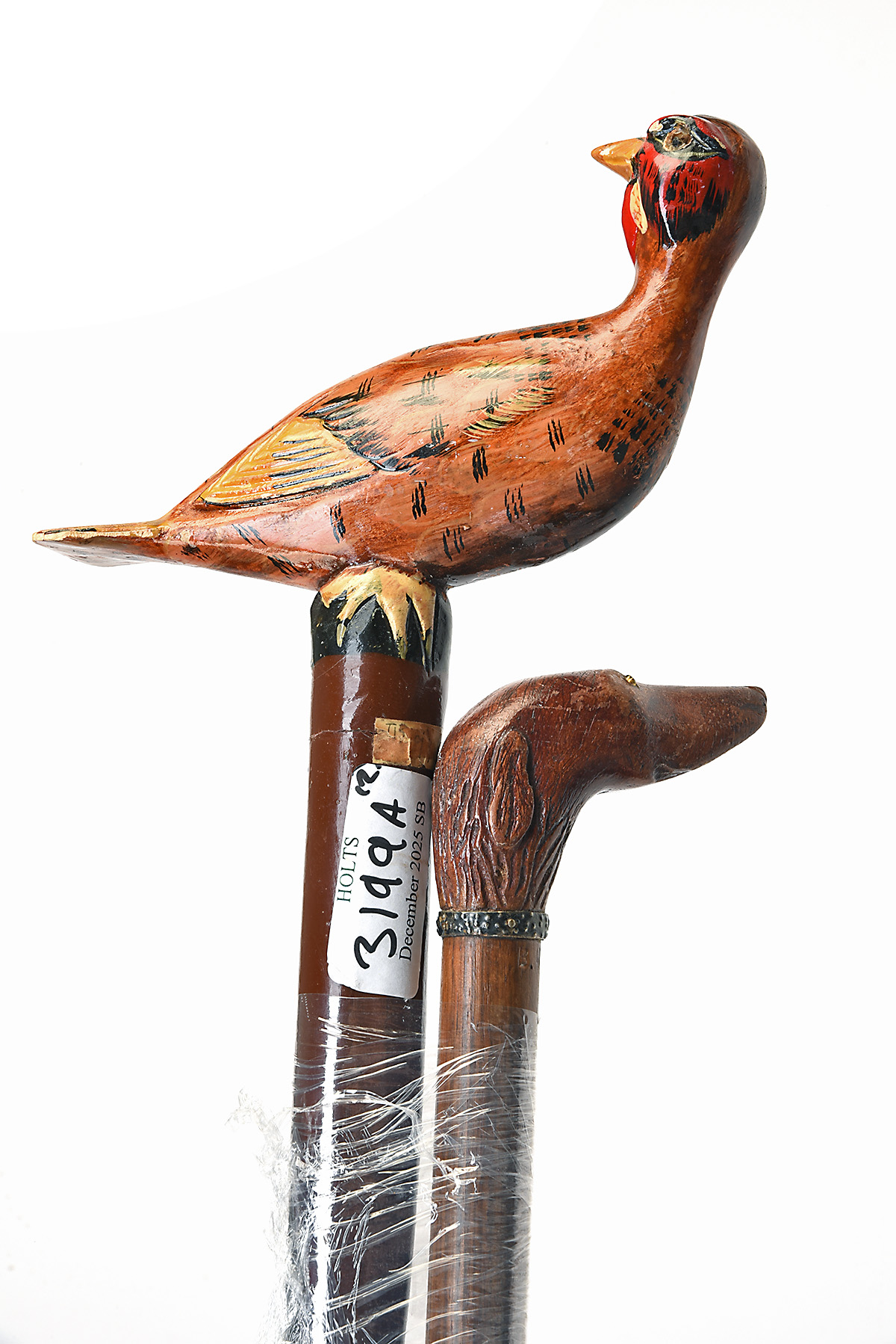 TWO WOOD WALKING STICKS, a 'B. OVER' with carved handle of a hunting dog approx. 36in. length, unsigned with carved pheasant handle approx. 40in. length (2)
