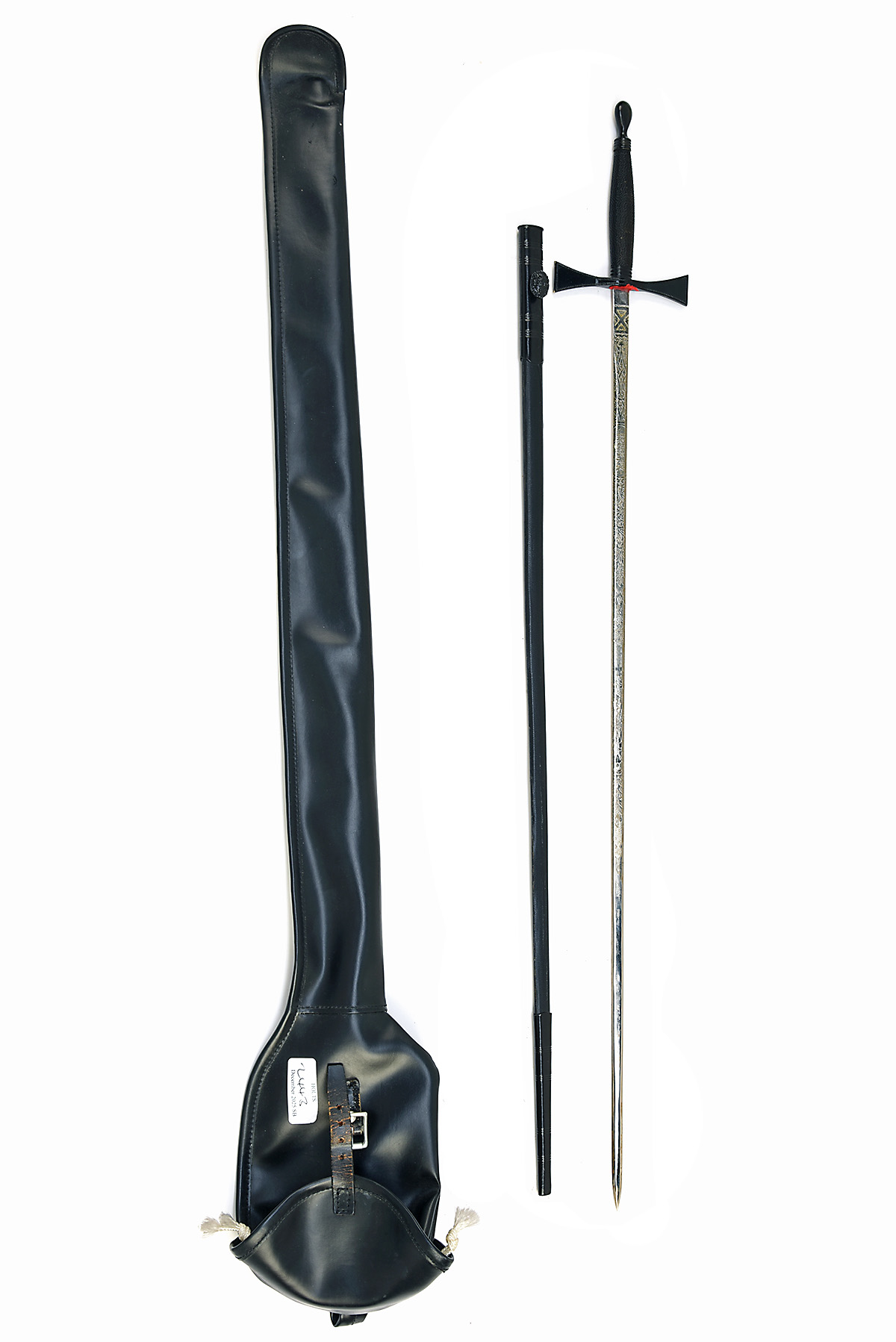 A MODERN MASONIC DRESS SWORD, with 27 1/2 in. cast steel double flat-edged blade with Masonic symbols and m arked 'TOYE KENNING / AND SPENCER', ricasso marked 'TOLEDO / SPAIN', black painted cross-guard and hilt, together with its black painted scabbard and faux black leather carrying bag