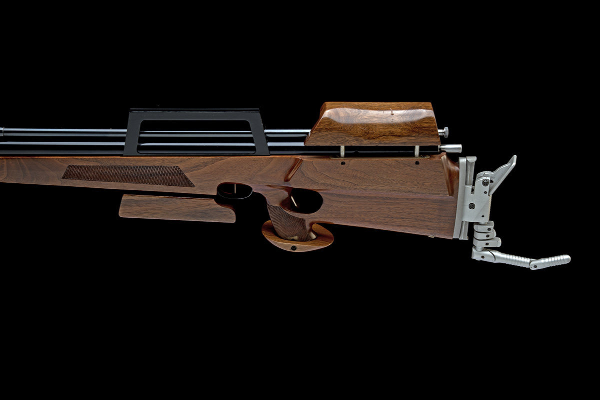 for 1989, with 24 3/4in. blued barrel including gloss black anodised muzzle-break, blued receiver with make and model etched on the left hand face concealed under the adjustable comb, twist and pull bolt and push cocking piece at rear (tested), walnut anatomical right hand thumb-hole full-stock with adjustable hooked butt-pad, cheek-pad and chequered grip, broad flat beavertail fore-end, gloss-black finished under-barrel reservoir, fitted with a forward mounted carry-handle with dove-tailed rail and including a custom Leupold 8.5-25x50 telescopic sight reworked by Premier to between 12-25 power and fitted with a Premier 30-30 reticle, currently not fitted but including Sportsmatch mounts with plated screws, a sun-shade and mounted with a folding spirit-level, the whole in an abs plastic travel-case