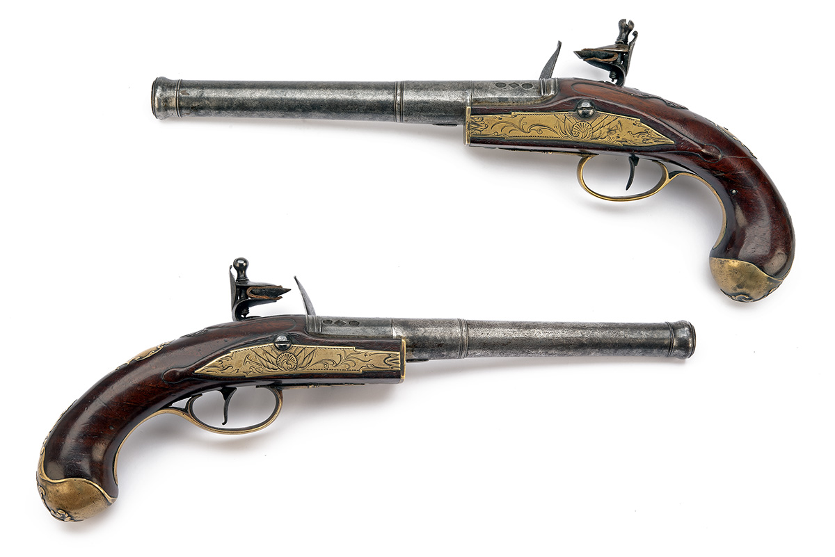 circa 1730, with turn-off iron banded 6 1/2in. cannon-barrels, the breeches with 'CLARKSON, LONDON' and London proofs, moulded bands forwards of the solid engraved and pointed top-tangs, flat border engraved bevel-edged locks with en-suite swan-necked cocks, engraved pan edges and recumbent 'L' shaped frizzen springs with 'CLARKSON' signatures below, walnut half-stocks (one cracked through and well repaired at wrist), shell-carved aprons and teardrops behind the locks and sideplates, brass furniture including short-tailed bulbous butt-caps moulded with foliate designs in relief, sideplates engraved with musical trophies and engraved flat front-plates, rococo escutcheons to wrists, no provision for ramrods