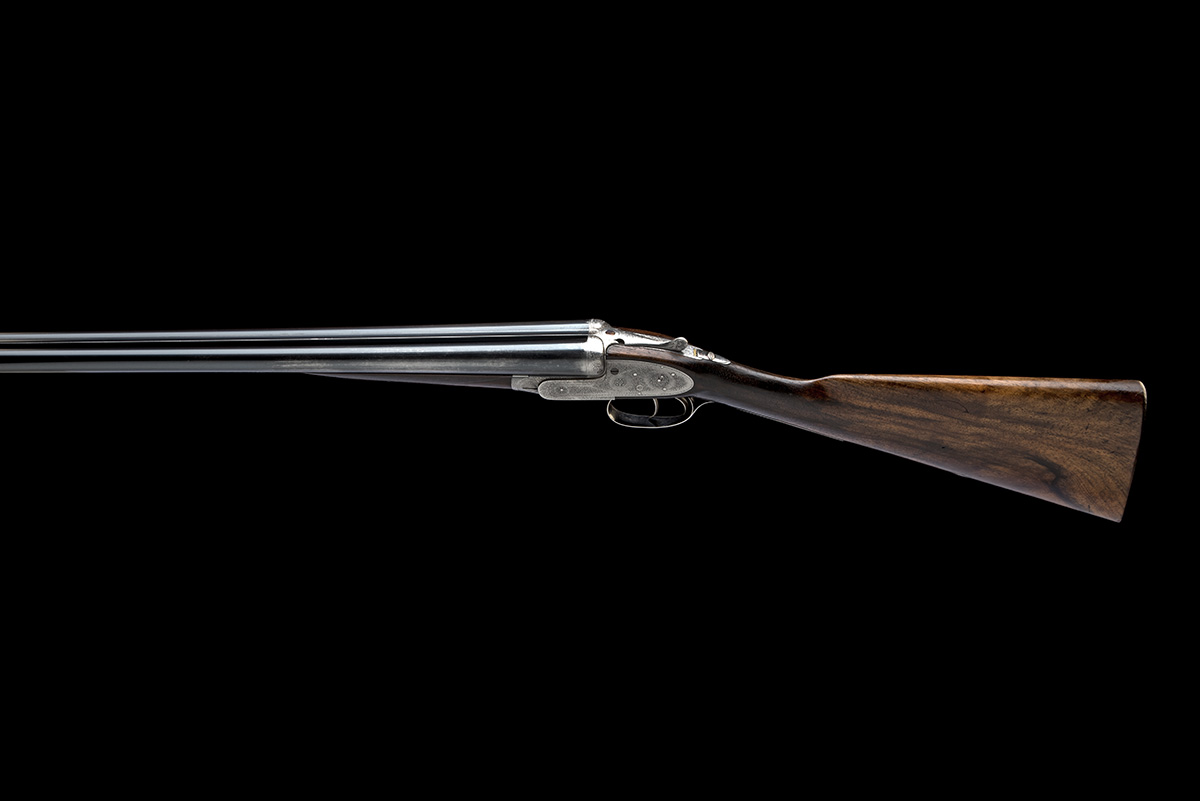 circa 1910, 28in. nitro chopperlump barrels (loose on action), rib inscription rubbed, 2 1/2in. chambers, bored approx. true cyl. and imp. cyl. choke, bore dimensions marginal, removable striker discs, automatic safety with gold-inlaid 'SAFE' detail, cocking-indicators, best fine acanthus scroll engraving with floral bouquets, brushed finish, 14 3/4in. stock (worn and with cracks to head and hand, left overhorn springing), weight 6lb. 7oz.