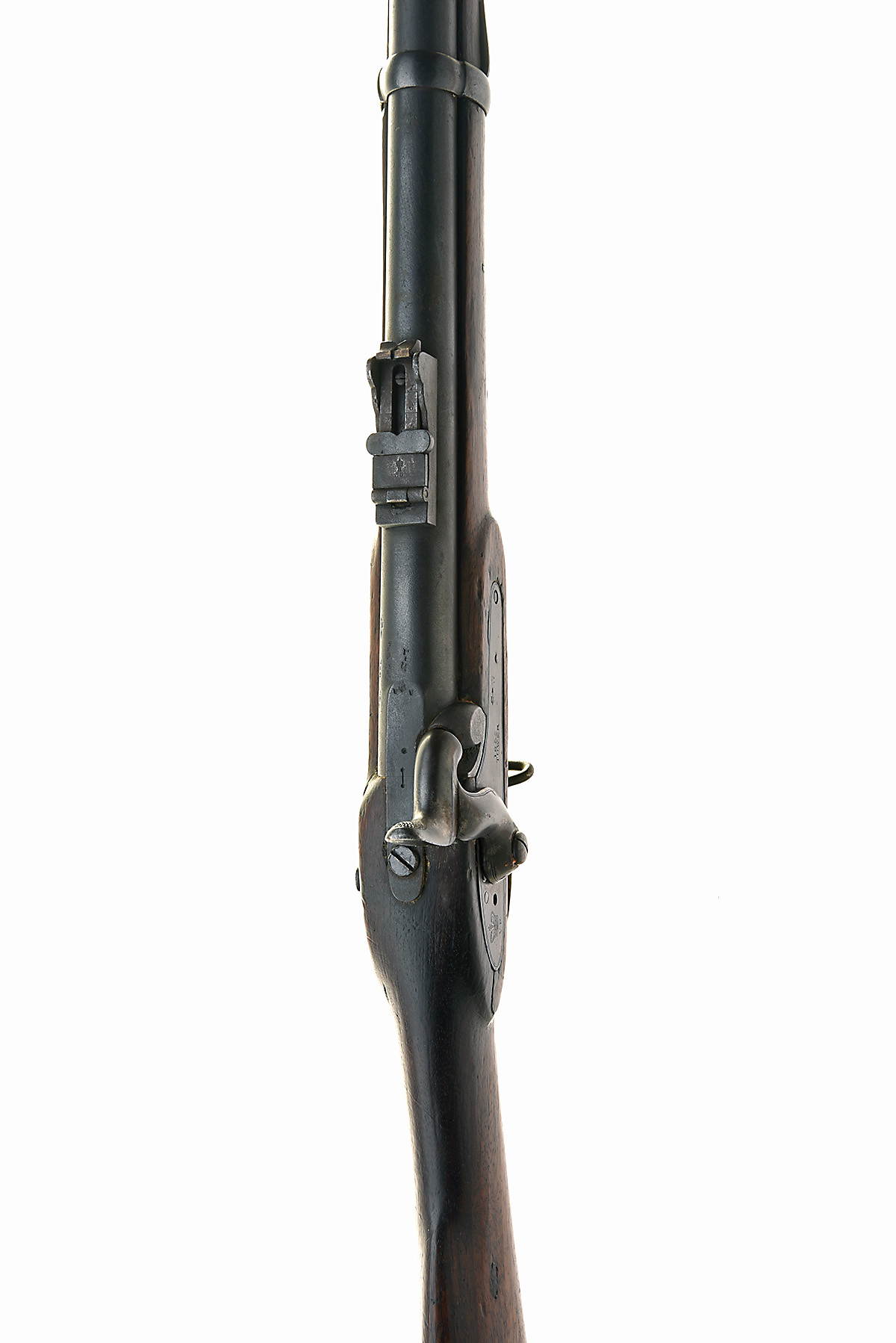 A .577 PERCUSSION PATTERN 1853 ENFIELD RIFLE-MUSKET SECOND TYPE SERVICE RIFLE, SIGNED TOWER, no visible serial number dated 1855, with 39 in. sighted barrel with Birmingham inspection marks, border-engraved lock with crown over 'V.R', lock-viewer's mark and '1855 / TOWER', full stocked, three spring-retained barrel-bands, complete with sling swivels and rammer, worn, stock cracked around the lock with chipped losses, butt with losses, some with large, crude, wooden inlays, trigger-guard tang broken through the screw-hole, some replaced screws