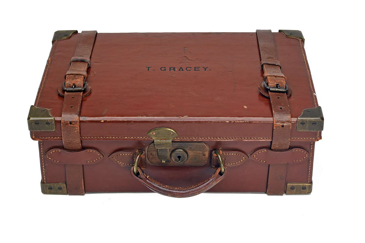 fitted for approx. 300 cartridges, the interior lined with grey baize, a William Powell & Son trade label, four dividers, five leather lifters, brass lock (key missing), the lid exterior marked 'T. GRACEY'