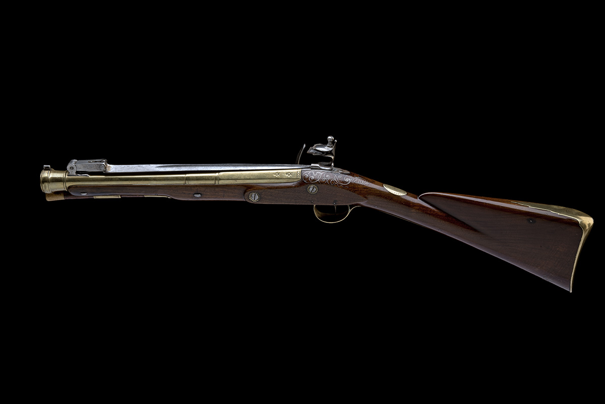 circa 1780, with 14in. triple-staged banded cannon barrel, triangular cross-section bayonet released by a catch at the tang to top of barrel and concealing the script signature 'LONDON', flat bevel edged lock with scroll engraving (rubbed) and stepped tail, the inside of lock with 'NOCK LONDON' signature (possibly spurious), walnut hand-rail full-stock with wire scroll inlays forming an apron around the top-tang, brass furniture including acorn finial and bone-tipped wood ramrod