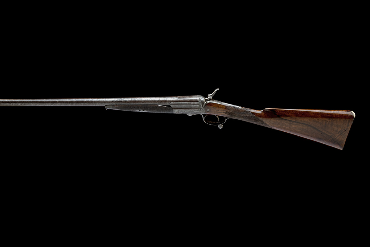 for 1874, 30 1/8in. black powder only reproved bold damascus barrel (in 1984), engraved 'JOSh. LANG & SONS. 22 COCKSPUR STREET. LONDON.', 2 1/2in. chamber, bored approx. true cyl., Jones patent rotary-underlever, arcaded standing breech, unusual centered percussion fence, rebounding back-action lock, hammer with hare's-ear spur and extended nose to strike centrally placed firing pin, fine beaded border and acanthus scroll engraving, retaining slight traces of original colour-hardening in sheltered areas, 13 1/2in. figured stock with engraved steel heel and toe plates, fore-end with cross-pin release catch and carved horn finial, small chip left edge, weight 5lb. 7oz.