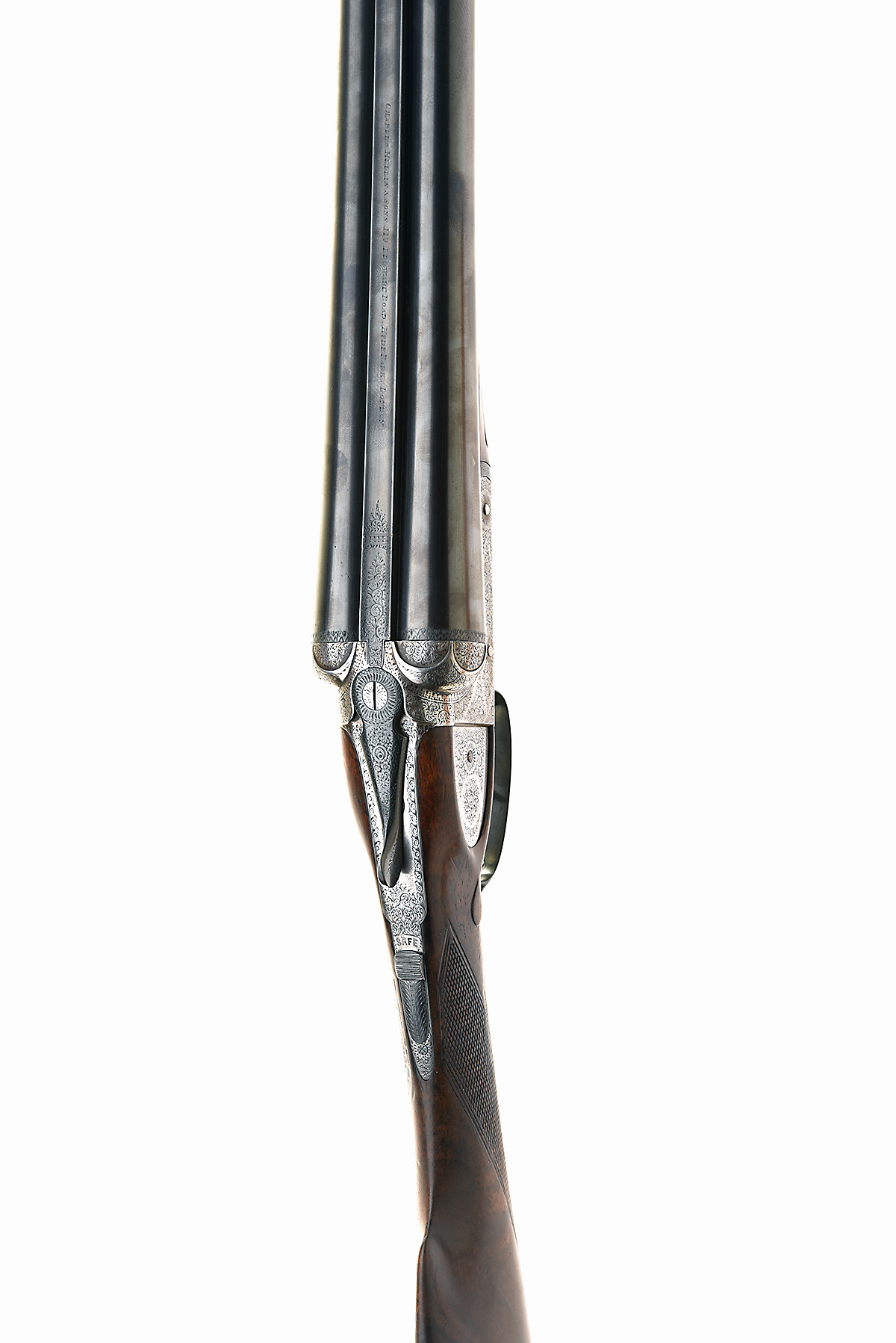 CHARLES HELLIS & SONS 12-BORE SIDEPLATED BOXLOCK EJECTOR, serial no. 2155, circa 1908, 28in. nitro barrels, the rib engraved 'CHARLES HELLIS & SONS. 119. EDGEWARE ROAD. HYDE PARK. LONDON.', 2 1/2in. chambers, bored approx. imp. cyl. and 1/4 choke, treble-grip action with arcaded fences, automatic safety, action and recessed decorative sideplate with fine acanthus scroll engraving with floral bouquets, brushed bright and reblued finish, 14 7/8in. stock, weight 6lb. 7oz.