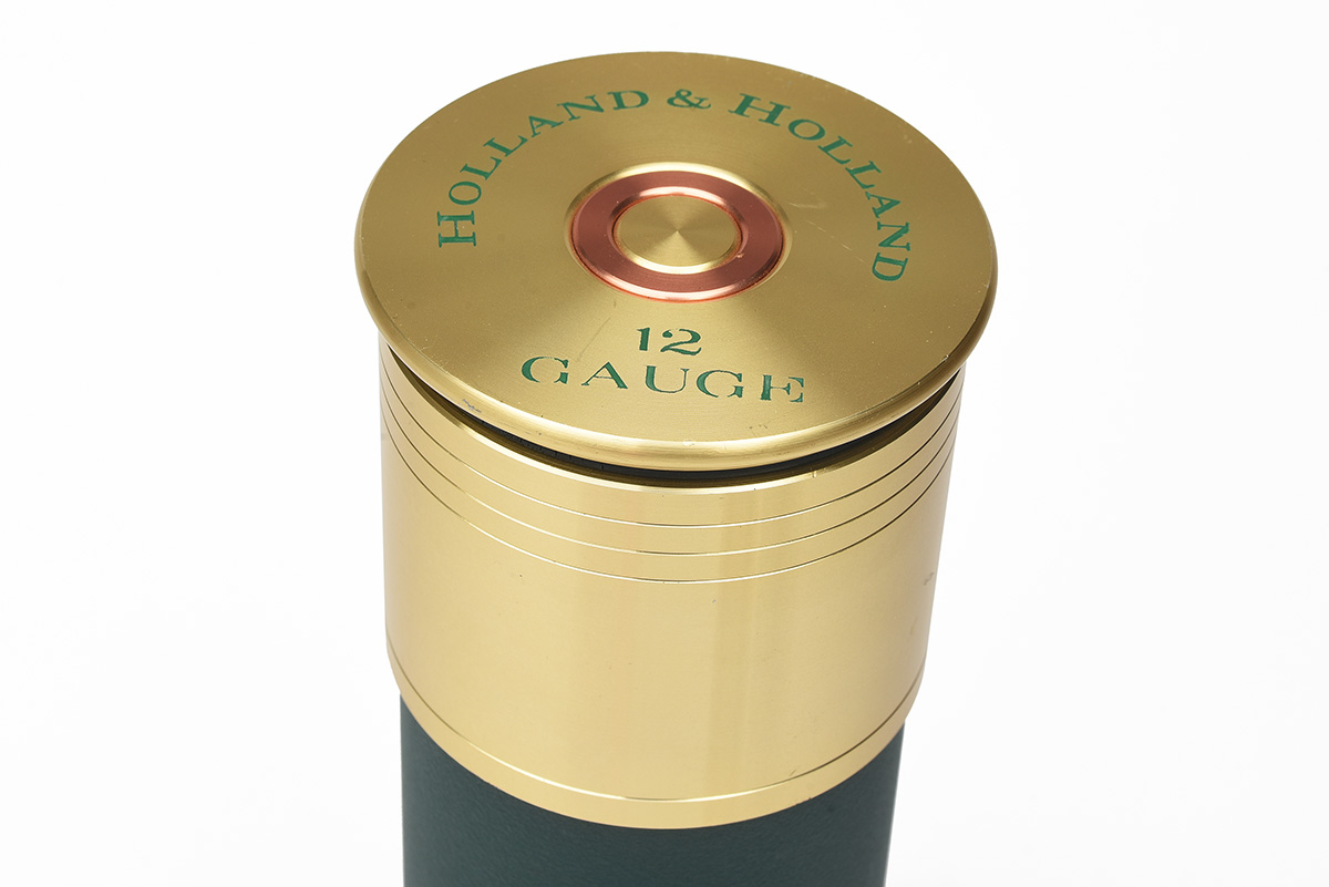 finished in stippled green paint and marked in gold lettering on the body 'HOLLAND & HOLLAND', brass furniture including turn-off brass end-cap marked 'HOLLAND & HOLLAND 12 GAUGE' with imitation central primer and unscrewing to reveal the lined interior compartment with moisture filter, approximately 9 3/8in. tall overall and appearing unused