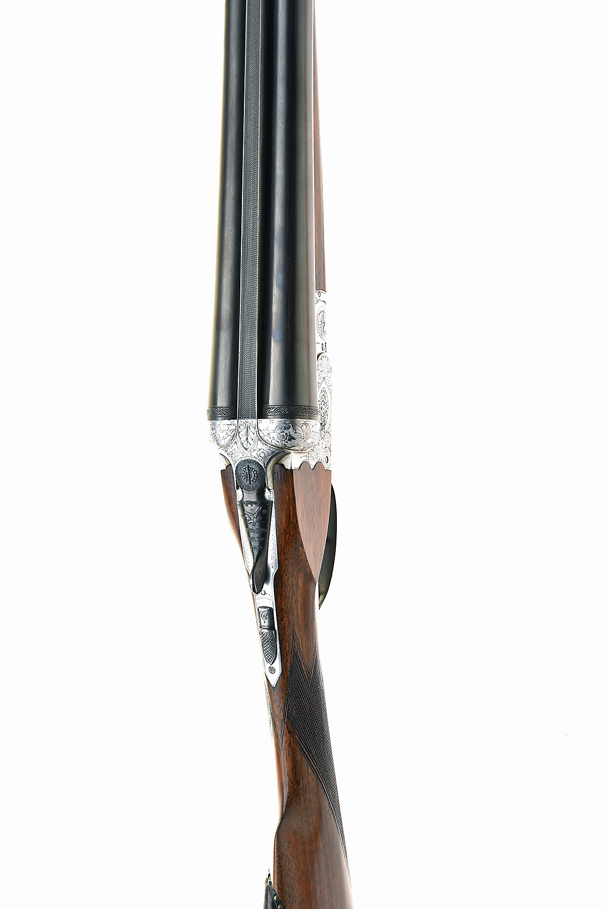 ITALIAN 12-BORE BOXLOCK EJECTOR, serial no. 3761, for 1958, the action and barrel flats with the makers code 'LS' within a star, 27 1/2in. nitro barrels, 2 3/4in. chambers, bored approx. full choke in both, stepped scroll-backed treble-grip action with hidden third-bite, gas-checks, toplever engraved with a bird, manual safety with engraved 'S' detail, border acanthus scroll and floral bouquet engraving, 14 1/8in. stock with leather cheekpiece, in a slip