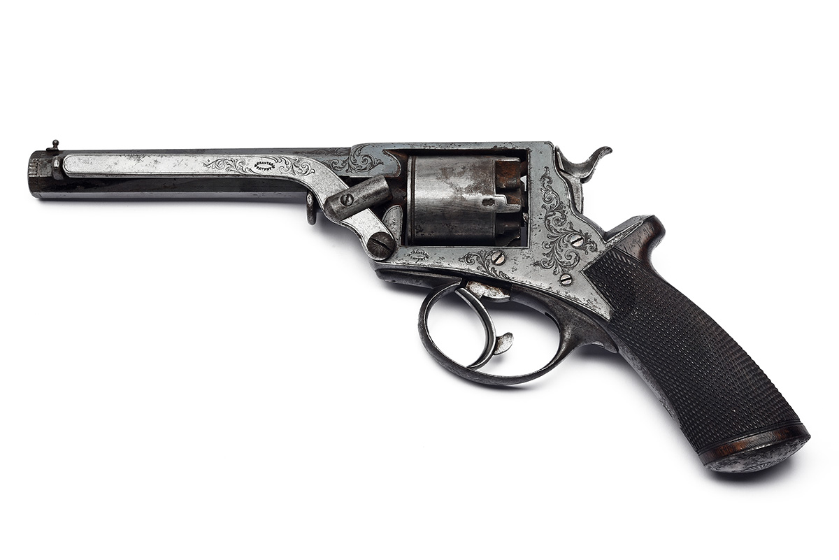 circa 1859, 4th model with blued octagonal 6in. barrel, dove-tailed bead fore-sight, engraved band at muzzle, scroll engraving at barrel throat, the solid top-strap border engraved and signed 'B. COGSWELL 224 STRAND LONDON', notch rear-sight to top of standing breech, plain borderline engraved five-shot cylinder with traces of colour, borderline and scroll engraved frame, double-action only trigger with spurred hammer, chequered walnut saw-handled grip and Tranter's Patent rammer fitted to left side of barrel, much finish and traces of colour, in its green baize-lined oak case with B. Cogswell trade label, a flask, loading rod, oil bottle and bone nipple-pot