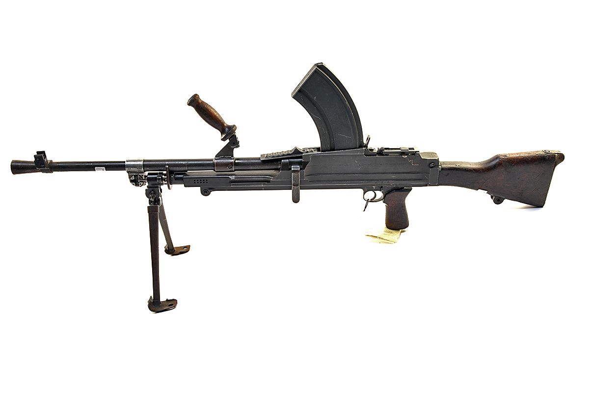 A DEACTIVATED INGLIS .303 (BRIT.) 'MODEL BREN MKII' LIGHT MACHINE GUN, serial no. 8T7794, dated 1943, 25 1/2in. barrel including flared flash hider, offset blade fore-sight with side protectors, folding ladder aperture rear sight, wooden carry handle, detachable top-mounted magazine, blued finish, wooden pistolgrip stock, folding bipod, rear monopod missing, together with its EU deactivation certificate