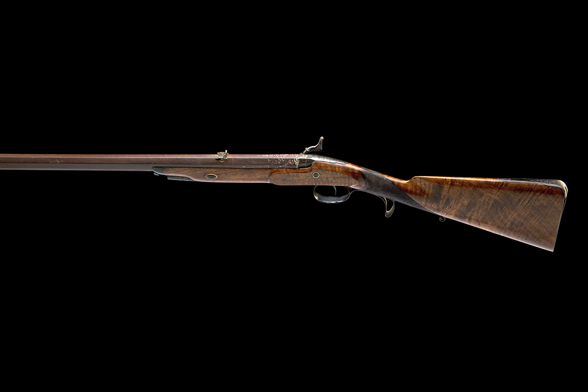 circa 1840, with 25in. browned octagonal double groove rifled barrel, dove-tailed blade fore-sight and rear standing notch with two folding leaves, barrel top-flat engraved 'EDINBURGH', border and scroll engraved top-tang and bar-lock action signed 'HENRY' with engraved dolphin-head hammer (repaired), walnut half-stock with straight hand grip chequered at wrist, engraved iron heel-plate top-tang, white-metal rectangular clipped corner escutcheon engraved 'JD', to underside of stock, single set trigger, guard bow with integral raised tang-piece, white-metal barrel key escutcheon with horn nose-cap, under rib and ramrod missing
