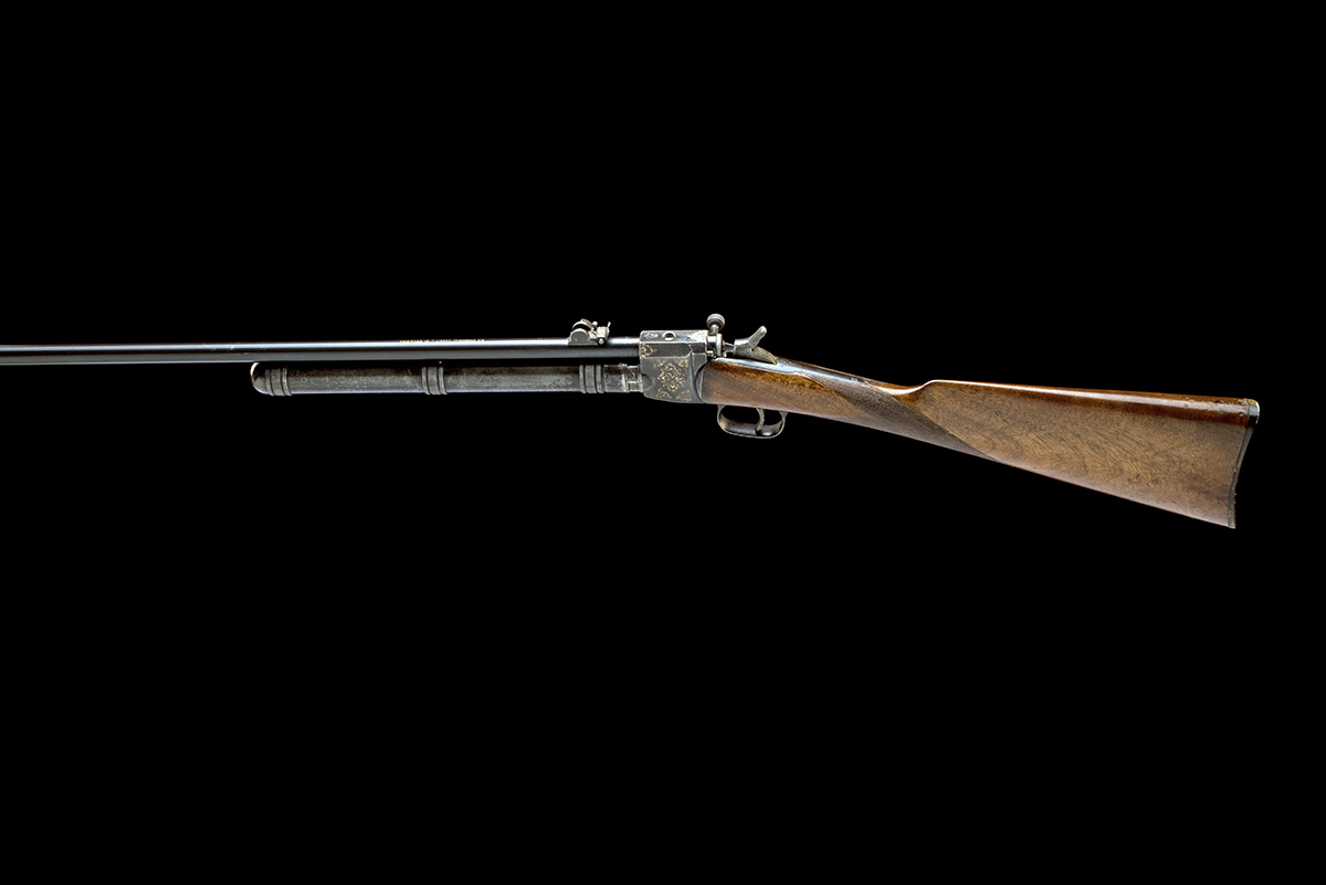 circa 1890, with 25 1/4in. rifled, round barrel signed in gilt (losses) 'St. STEPHANOISE D'ARMES - ST. ETIENNE', beaded blade fore-sight, dove-tailed elevating rear-sight locking with a wing-nut, pre-charged cylinder beneath the barrel with knurled decoration numbered '19116', slab-sided action engraved with foliage and scrollwork with traces of gold painted infill, rotating tap for ball, external central hammer, walnut straight-hand butt-stock with chequered wrist, hard-rubber heel-plate embossed with an air balloon trademark and marked 'PAUL GIFFARD INVENTEUR', colour hardened trigger, engraved guard, the whole retaining a strong amount of fading finish