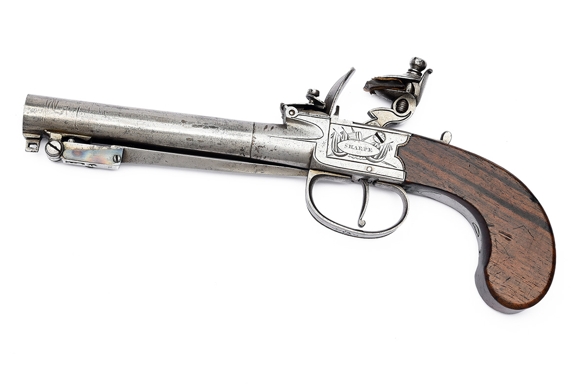 A 36-BORE FLINTLOCK TURN-OFF PISTOL WITH SPRUNG BAYONET, SIGNED SHARPE, no visible serial number,