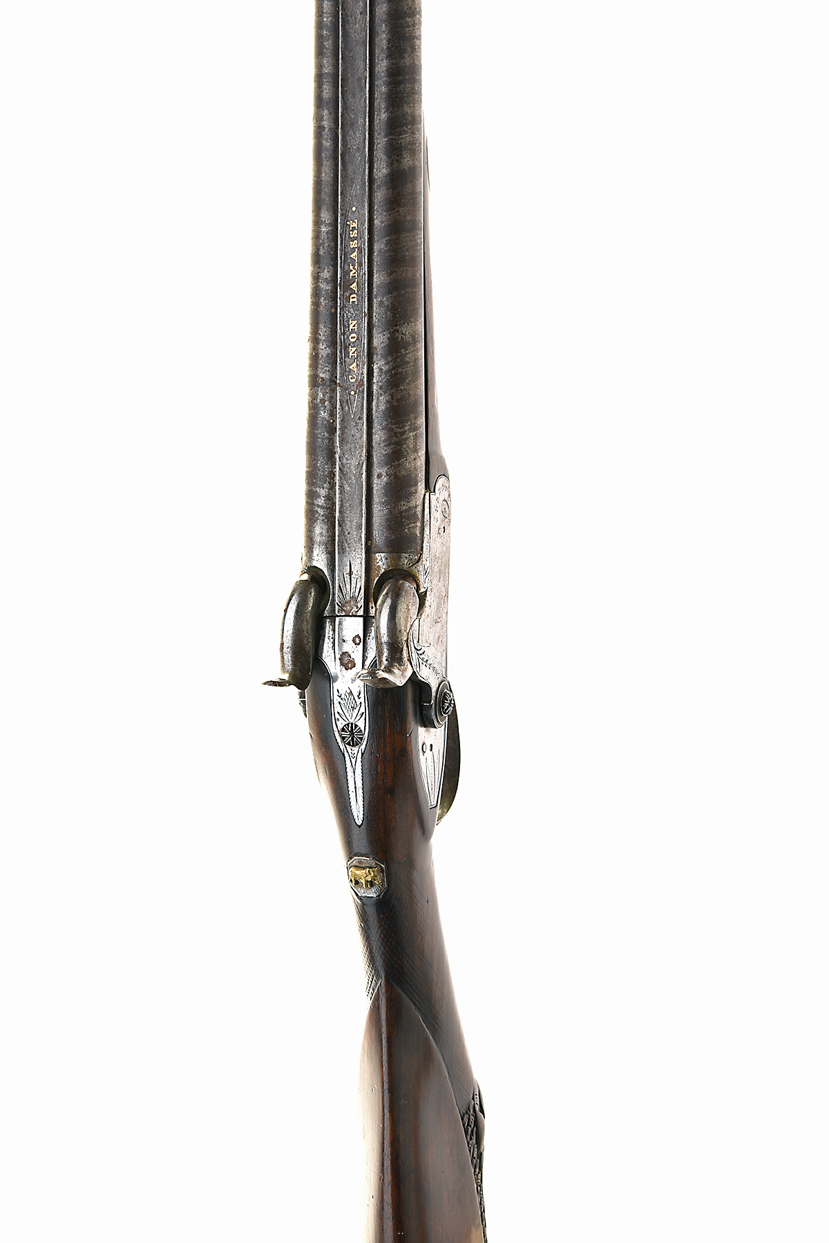 A 20-BORE PERCUSSION CONTINENTAL DOUBLE-BARRELLED SPORTING-GUN SIGNED CANON DAMASSE, no visible serial number,
