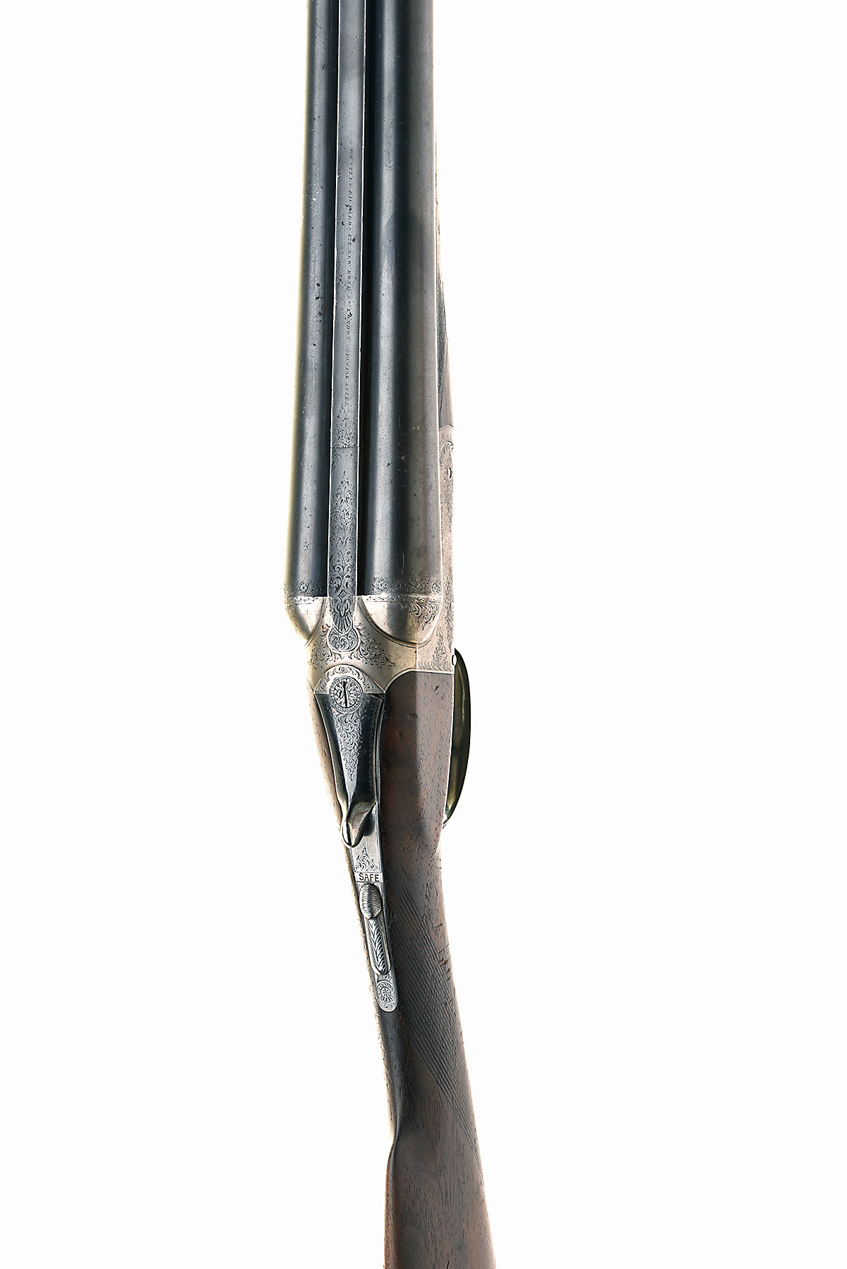 WESTLEY RICHARDS 12-BORE BOXLOCK EJECTOR, serial no. T8573, for 1924, 30in. nitro reproved chopperlump barrels (in 1957), the rib engraved 'WESTLEY RICHARDS. 178. NEW BOND ST. LONDON. SPECIAL STEEL.', and with acanthus scroll detailing at the breech-end, 2 1/2in. chambers, bored approx. true cyl. in both, treble-grip action, Westley Richards patent toplever, automatic safety with gold-inlaid 'SAFE' detail, border and partial acanthus scroll engraving, patinated finish, 15 5/8in. stock including horn buttplate (taped on and damaged at toe), fore-end with Deeley & Edge release catch and horn finial, wood split, weight 6lb. 12oz.