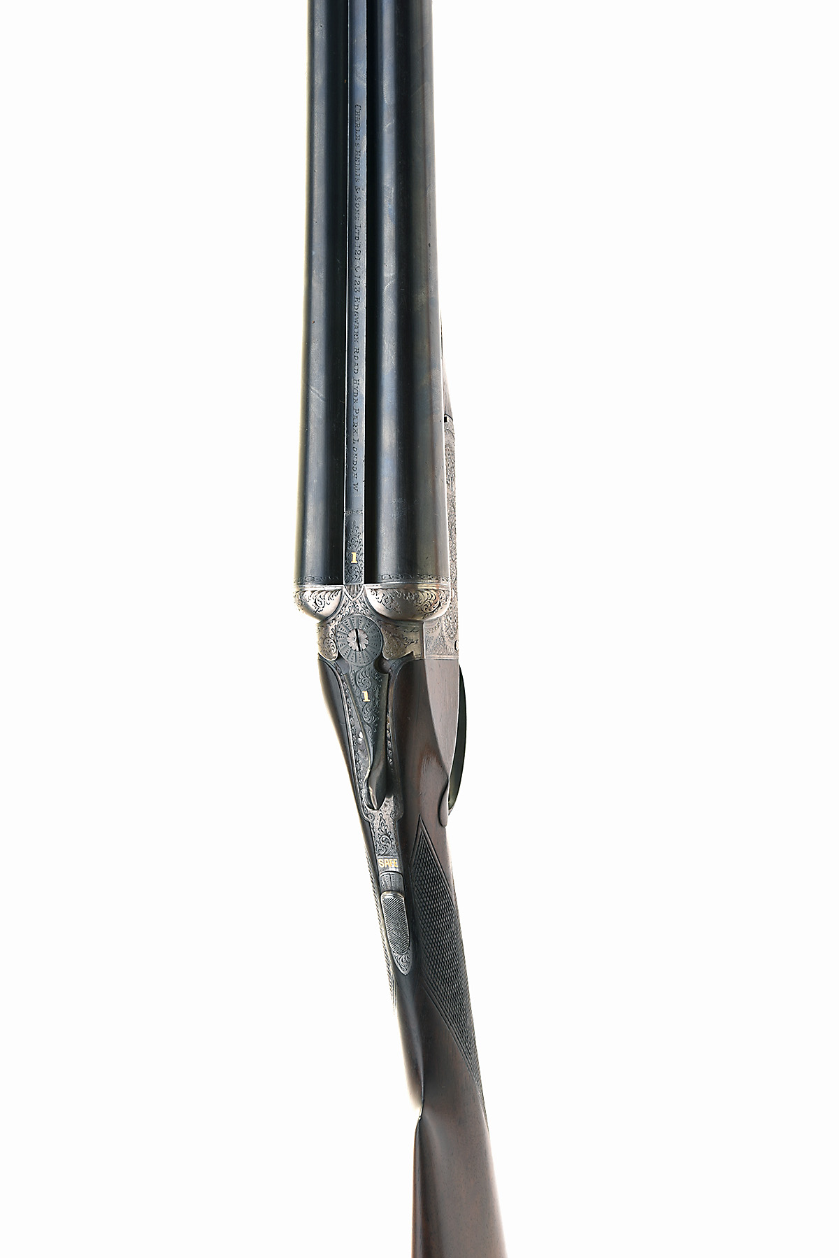 C. HELLIS & SONS LTD. 12-BORE BOXLOCK EJECTOR, serial no. 4305, dated 1937, 26in. nitro barrels, 2 1/2in. chambers, bored approx. 1/4 and full choke, toplever gold-inlaid '1', automatic safety with gold-inlaid 'SAFE' detail, border and acanthus scroll engraving with floral bouquets, retaining traces of original colour-hardening and finish, 15 1/4in. stock including 3/4in. wooden extension, weight 6lb. 7oz., in its canvas and leather case