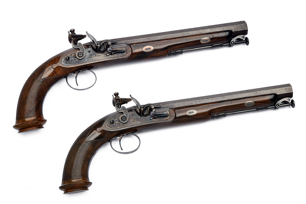 circa 1814, with browned laminated octagonal 10in. barrels, the top flats signed 'ROBERT WHEELER & SON, MAKERS TO HIS MAJESTY', bead fore-sights, colour hardened patent breech-blocks with engraved shell and quadruple platinum lines, borderline and scroll engraved colour hardened top-tangs with shallow notch rear-sights, platinum lined touch-holes, borderline and scroll engraved colour hardened locks signed 'ROBERT WHEELER & SON', roller frizzens with tilted rainproof pans, bolted safes behind the cocks, walnut full-stocks with chequered grips and moulded pommels, blued furniture, twin barrel keys and captive iron ramrods, both pistols being in outstanding condition and appearing little used with just light marks to the French polished stocks, in their maker's walnut case lined and compartmented in red baize (some hidden mothing), trade label inside lid and with a number of period accessories (some added later)