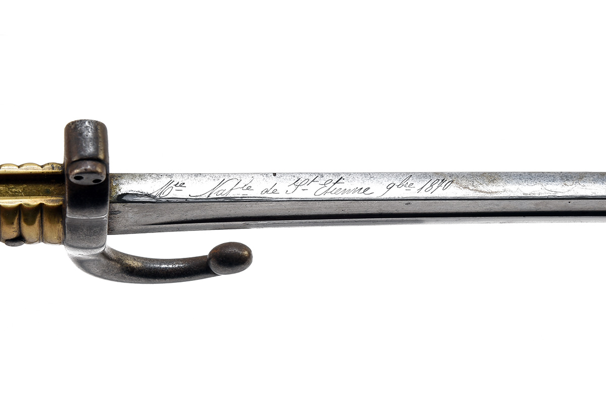 A FRENCH MODEL 1866 YATAGHAN SWORD BAYONET FOR THE CHASSEPOT RIFLE, dated 1870, with 22 1/2 in. single-edged blade fullered on each side, back engraved for St Etienne Arsenal, ricasso with inspection marks, quillioned cross-guard with inspection marks and serial number, brass hilt, steel scabbard, unmatched numbers, scabbard dented