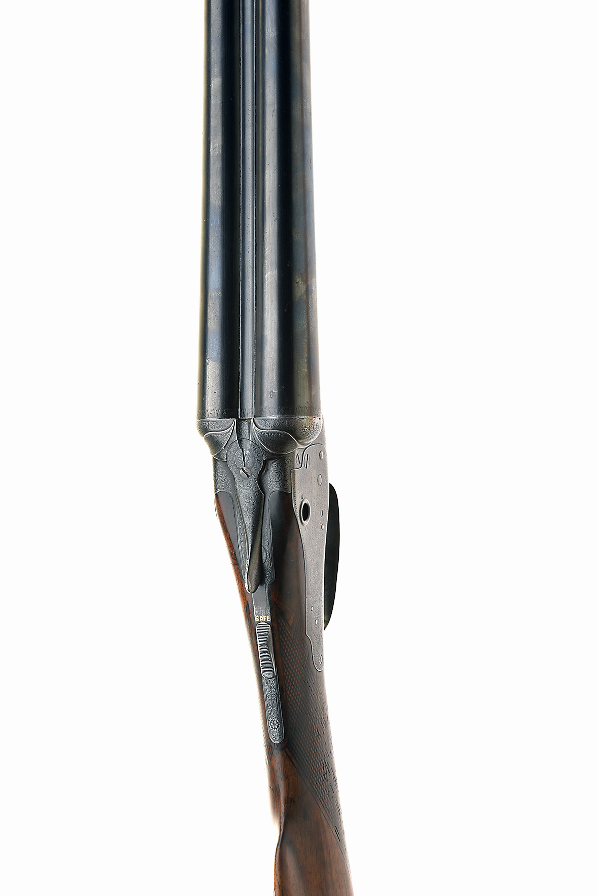 J. BLANCH & SON 12-BORE W. & C. SCOTT & SONS 1878 PATENT BACK-ACTION SIDELOCK NON-EJECTOR, serial no. 5365, circa 1885, 28in. nitro reproved blacked damascus barrels (in 1960, some dents), sunken rib engraved 'J. BLANCH & SON. 29 GRACECHURCH STREET. LONDON.' (faint), 2 1/2in. chambers, bored approx. true cyl. and full choke, W. & M. Scott and T. Baker patent barrel-cocking hammerless action, patent no. 761 of 1878, use number 1778, W. & C. Scott patent toplever spindle, Scott patent gas check system, patent no. 617 of 1882, use number 1150, W.& C. Scott patent automatic block safety, Scott patent crystal cocking-indicators, patent no. 3223 of 1875 with gold-washed internals, Needham & Hinton patent intercepting sears, patent no. 706 of 1879, fine acanthus scroll and floral bouquet engraving, the lockplates signed 'J. BLANCH & SON', blacked finish overall, 14in. figured stock, the left side stamped 'MURRAY', fore-end with J. Blanch & Son 'Improved snap bolt' release catch, weight 6lb. 8oz.
