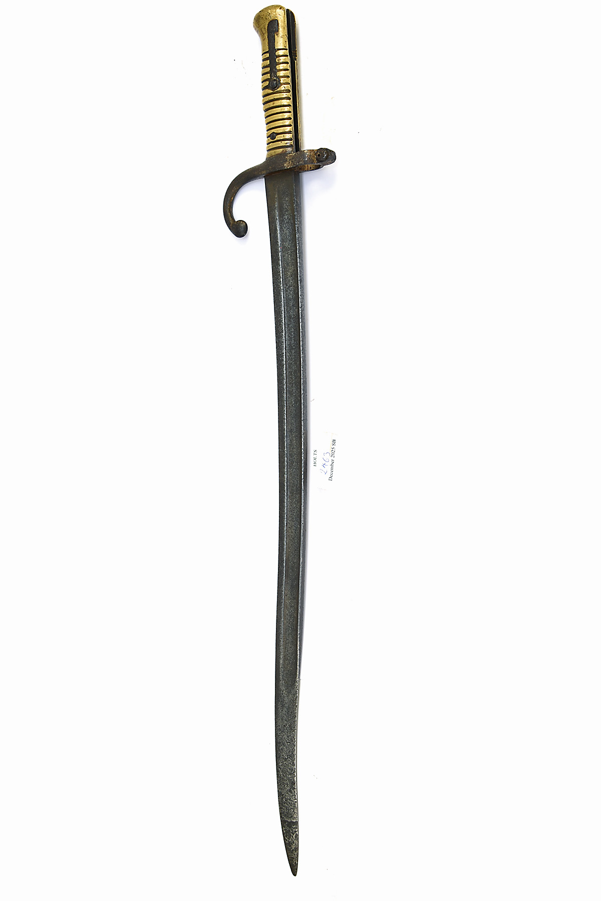 A BRASS HILTED YATAGHAN BAYONET, possibly for a French Chassepot rifle circa 1870, with broad blind-fullered 25 1/4in. blade, brass ribbed grip with iron muzzle-ring cross-guard and turned down quillion, no scabbard