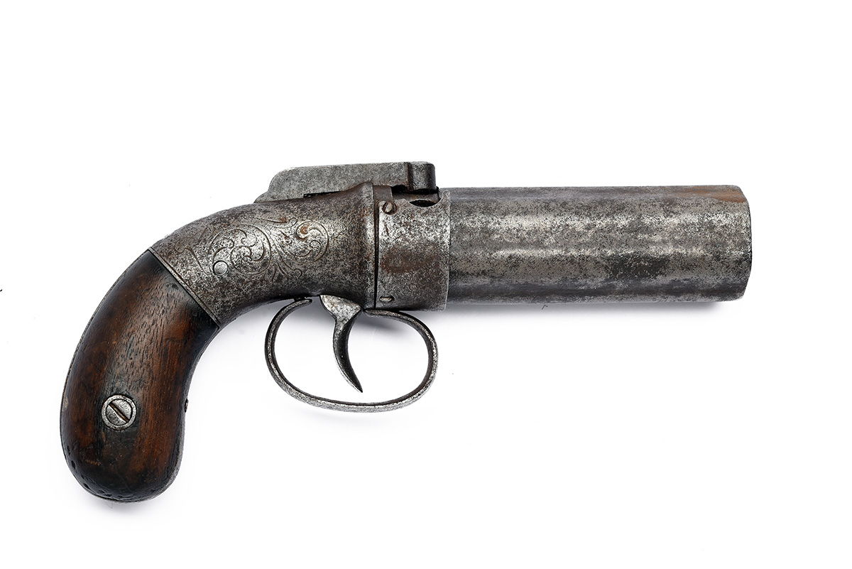 A UNITED STATES COMPOSED PAIR OF .32 6-SHOT PERCUSSION PEPPERBOX PISTOLS SIGNED ALLEN & THURBER, no visible serial numbers, 1850s, with 4 in. barrel clusters marked 'ALLEN & THURBER WORCESTER', scroll-engraved nipple-shields and frames, bar-hammers stamped 'ALLENS PATENT / 1845', walnut bag-shaped grips, heavily worn and pitted, one with a replacement cluster screw, the other with a loss to the nipple-shield
