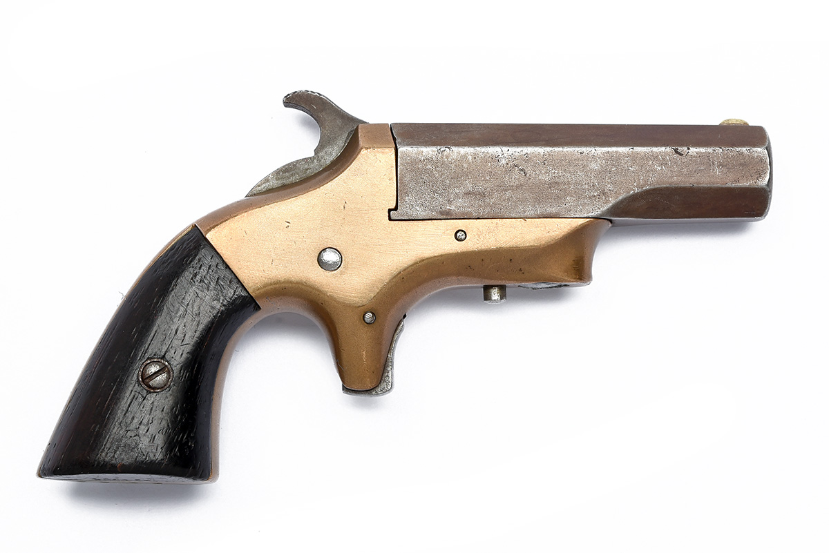 A UNITED STATES .41 SINGLE-SHOT RIM-FIRE SOUTHERNER DERINGER PISTOL, SIGNED BROWN, serial no.5052, Circa 1870, with 2 1/2 in. sighted octagonal barrel, the top flat engraved 'SOUTHERNER', and the left flat stamped 'BROWN MF'G.Co. / NEWBURY PORT. MASS. / PAT. APR 9 - 1867', brass frame, base of butt strap stamped '5052', blinded pitting on the barrel