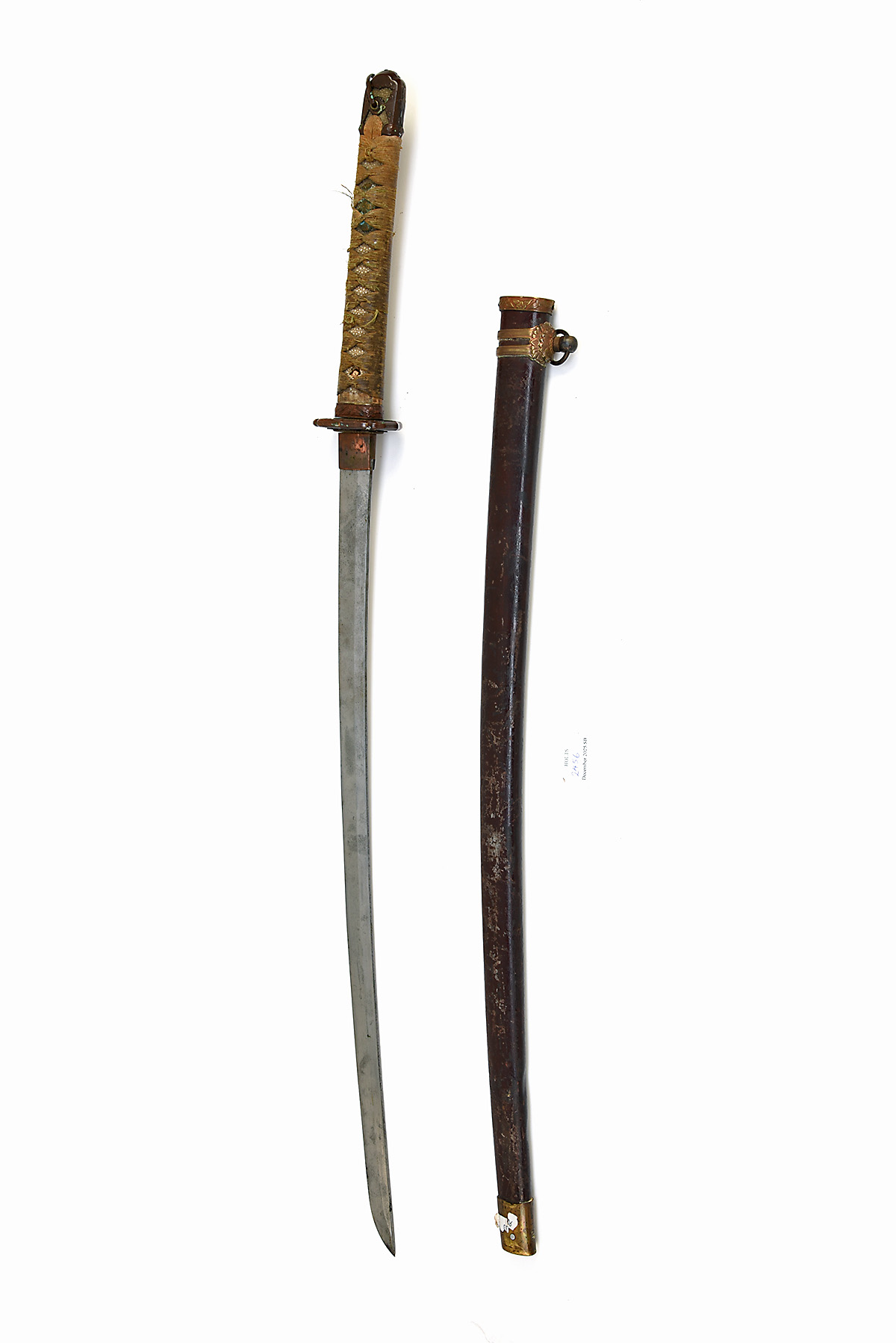 A JAPANESE KATANA WITH SIGNED BLADE IN SHIN-GUNTO MOUNTS, first half of the 20th century, with 25in. slightly curved blade (some mild corrosion stains and marks), copper habaki (loose), cotton-bound hilt with moulded and carved brass tsuba, lacquered metal scabbard with single suspension ring