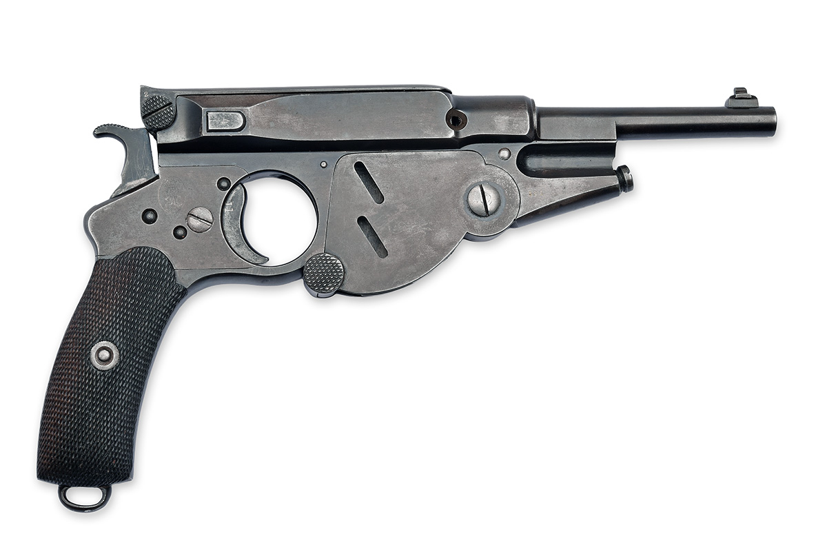 circa 1897, with tapering narrow re-blued 4 1/2in. barrel, raised block at muzzle with dove-tailed mounted fore-sight blade, early type bolt without extractor and fitted with an integral dust-cover, notch rear-sight and knurled thumb-piece to rear, blued receiver and frame (finish worn and faded), the frame numbered '518' and marked 'PATENT, BREVETE, S.G.D.G' on the left and stamped with the trademark for V.C. Schilling, Gaggenau on the right, sprung trapdoor on the right hand side for clip-loading, exposed hammer, chequered walnut grips and lanyard loop at heel, together with a tin-plate stripper-clip for same