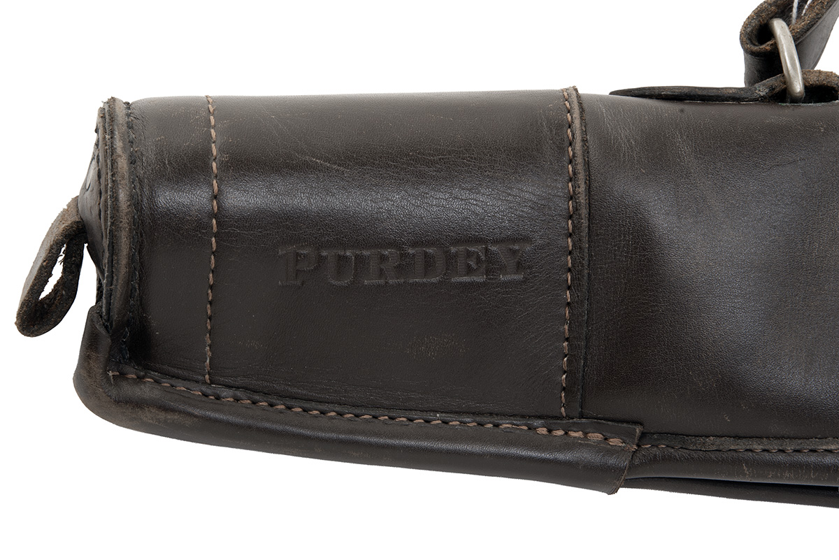 with leather shoulder strap and brass fittings, embossed Purdey inside and out, with blank oval leather name patch, measuring approx. 48in.