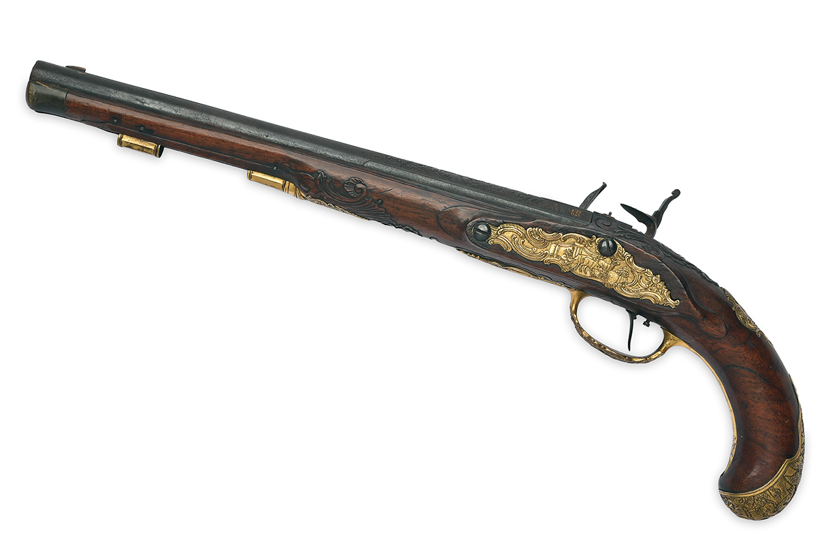 circa 1760, with iron 11 1/2in. barrel, the first half profusely chisel carved in relief with scrolls and shells around a central depiction of a standing stag, the forward section of barrel with raised moulded sighting rib signed 'IOH, IAC, KUCHENREUTER' in a yellow metal inlay, recessed muzzle, shallow blade fore-sight with inlaid foot, triple inlet poincons at breech, the top with a figure on horseback with the letters 'I' 'I' & 'K', the left and right with a crown and the same letters, standing notch rear-sight with two additional folding leaves, flat chisel-carved lock with gilded background, lozenge-shaped pan with unbridled frizzen, swan-necked cock with en-suite carving to the lock-plate (top-jaw and screw absent), walnut full-stock with moulded borders alongside the ramrod channel and around the finial and relief chisel carving around the apron and ramrod throat, rococo carved and gilded brass mounts, single set trigger and faceted ramrod pipes (ramrod absent, loss to fore-end tip)