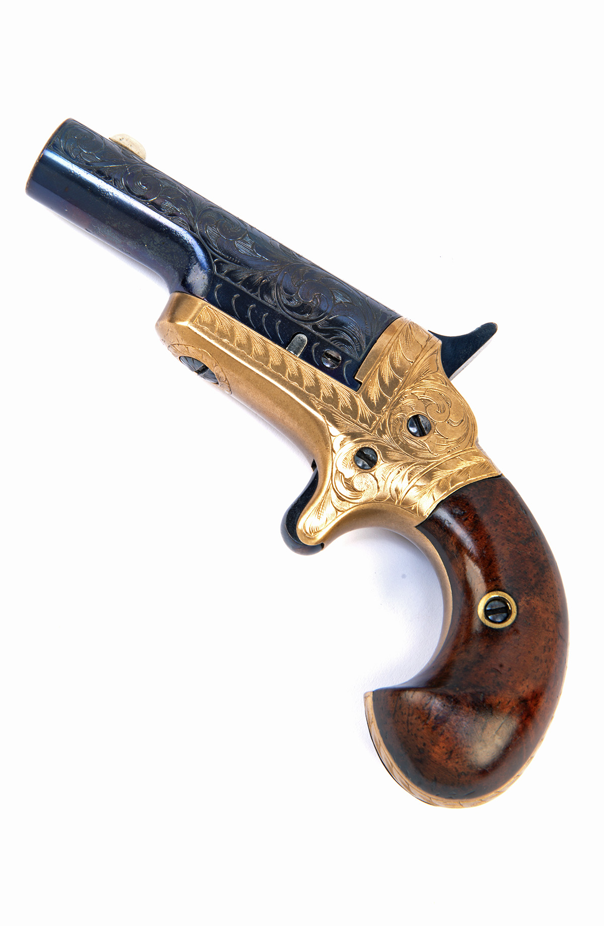 circa 1879, the engraving probably later, with 2 1/2in. reblued barrel with '-COLT-' engraved and inlaid in gold to the centre, both sides of the barrel engraved with large panels of American scrolls in the correct period style extending to the muzzle, white metal fore-sight, gilded brass frame and backstrap engraved en suite, reblued spur trigger and early-style upright hammer, two piece figured walnut early-style birdshead grips concealing the serial number on frame