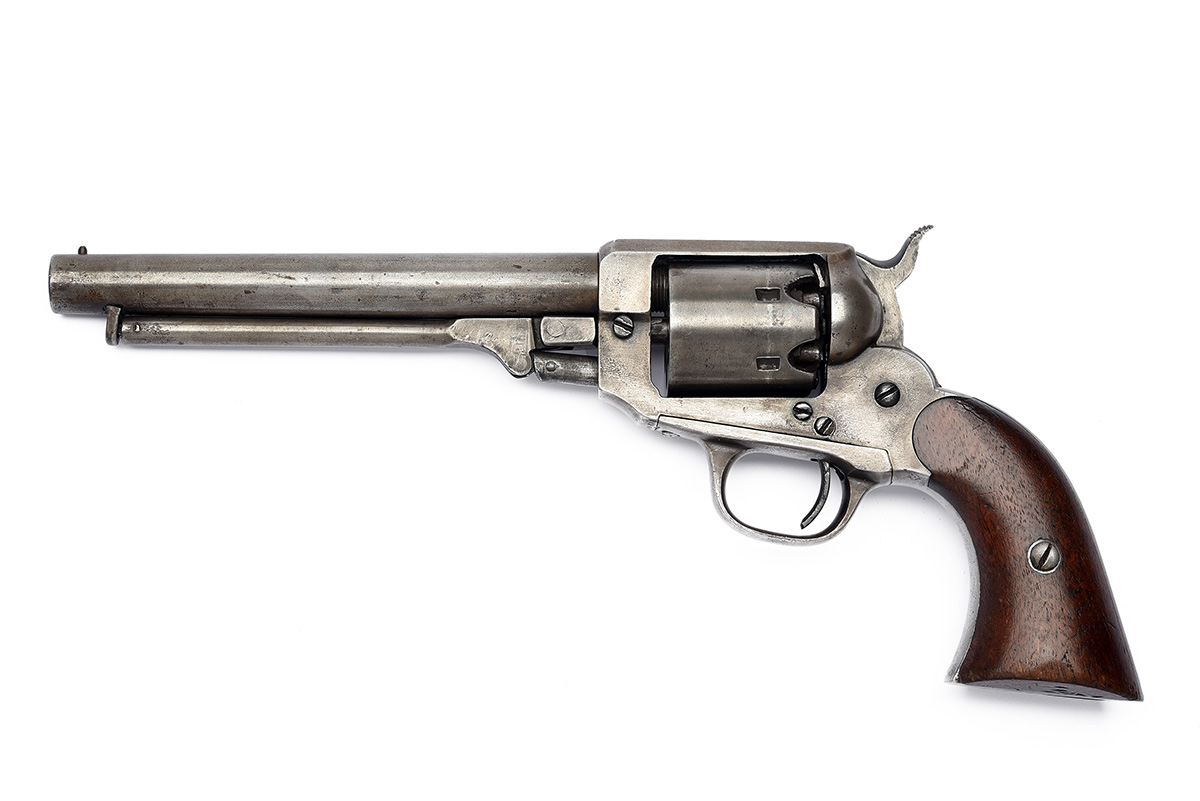 circa 1864, with round 5 7/8in. barrel stamped on the top 'ADDRESS W. IRVING 20 CLIFF ST', bead fore-sight, solid iron frame with sighting groove to top-strap, plain six-shot cylinder, single action mechanism, smooth flared walnut grips (right repaired) and articulated under-barrel rammer