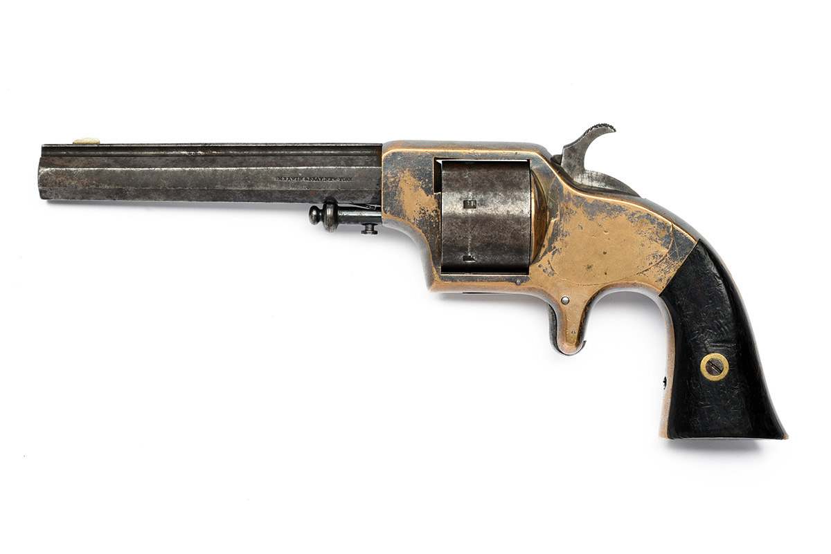 circa 1865, with 5 1/2in. octagonal barrel, the left hand side marked 'MERWIN & BRAY NEW-YORK', the raised sighting rib signed 'PLANT'S MFG CO NEWHAVEN C.T.', brass frame (traces of silver-plate remaining), rear-mounted ejector-rod, plain iron cylinder (bored through) marked with patent dates around the circumference, two-piece flared grips and sheath trigger