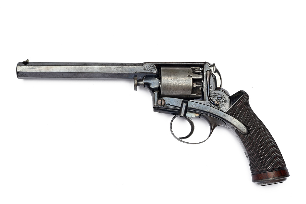 circa 1854, with blued 6 3/16in. barrel, scroll engraving to sides of barrel-throat, dove-tailed fore-sight, the top-strap signed 'DOOLEY, 11 RANELAGH ST., LIVERPOOL', plain five-shot cylinder with traces of faded colour, borderline and scroll engraved solid frame with 'L' shaped safe spring and frame-mounted swivel rammer (possibly added later), chequered walnut grip, guarded self-cocking trigger, spurless hammer and iron grip-cap, much blued finish remaining, in its maker's oak casing relined in green baize but retaining the original jade-green parchment trade-label and together with a period flask, mould, nipple-key and a cap bag bearing a Westley Richards label, the outer case lid with a brass escutcheon marked 'MR GEO. STONE, LIVERPOOL' and later brass corners