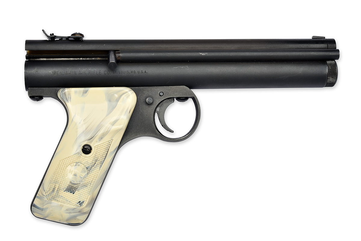 manufactured between 1969-73, with 6 1/2in. barrel, loaded by a side mounted plunger with tubular spring-housing, under-barrel reservoir with left side cocking handle, guarded trigger with push-button safe and chequered mottled white plastic grips, retaining virtually all its original finish (untested)