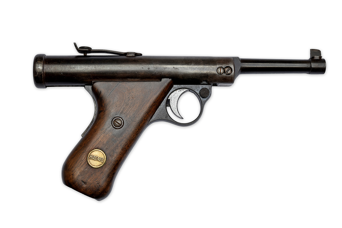 circa 1934, with two 4in. interchangeable break-open to load barrels, dove-tailed fore-sights, plain air-chamber lifting to cock via release catch on the trigger guard and with patent markings including 'HAENEL MOD 28, BRIT PAT. No. 277265 D.R.P.', buckhorn rear-sight, smooth walnut grips with brass Haenel medallions, the whole an older faded refinish, in its maker's English market brown card carton, the lid with an illustration of the pistol against a target background surrounded by the make and model details, all above 'PATENT APPLIED FOR IN ALL COUNTRIES' and 'BRITISH PATENT 277265', instructions inside lid (edges of lid worn and cracked)