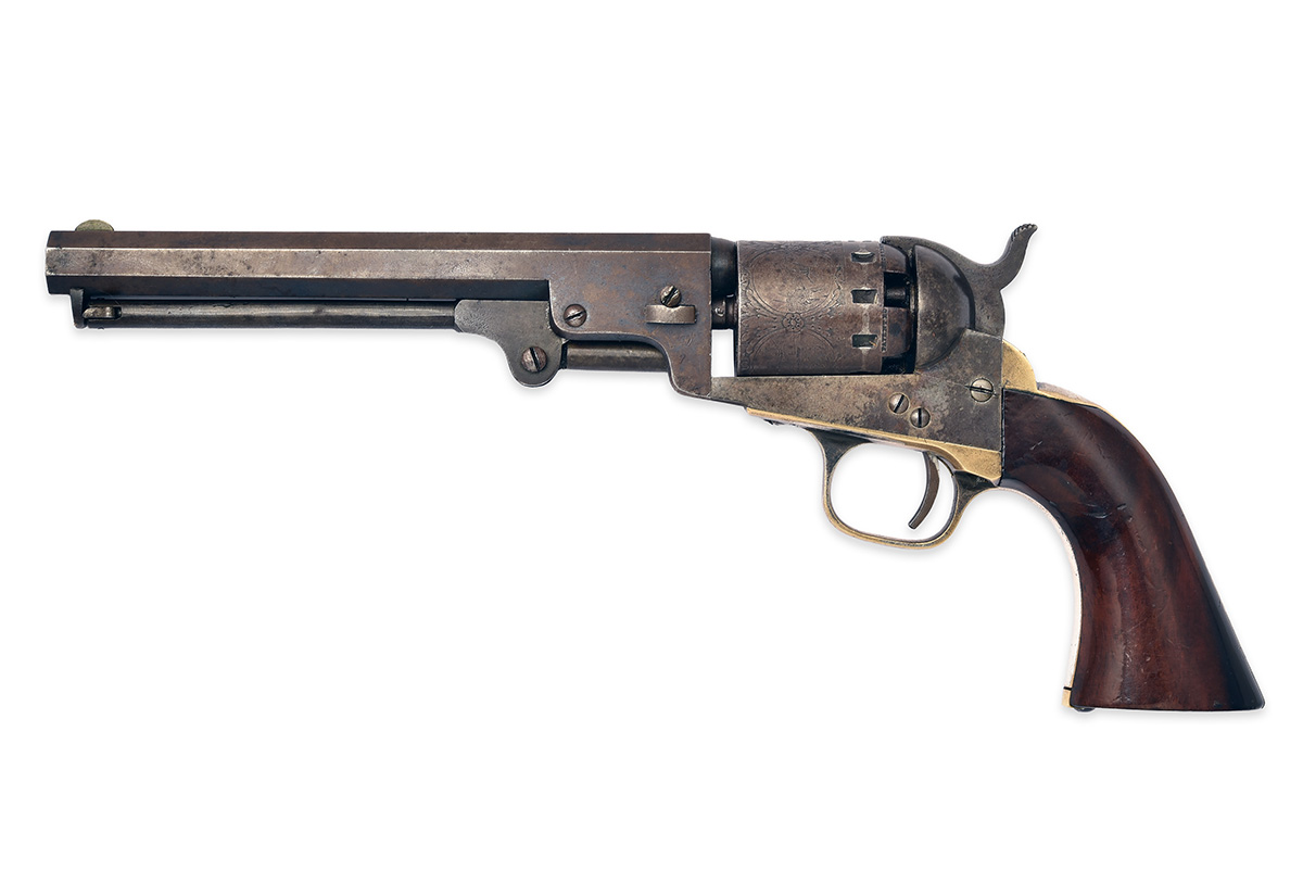the revolver a series 'II' circa 1862 with octagonal 6 1/2in. barrel signed on one line 'MANHATTAN FIRE ARMS MFG. CO. NEW YORK.', applied crescent fore-sight, colour hardened open iron frame (traces of colour remaining), five-shot cylinder engraved with five battle-scene panels framed by scrolls and marked 'PATENTED DEC. 27 1859', ten locking notches, single-action mechanism, brass grip-straps with traces of silver plated finish and smooth flared walnut grips, fair amount of finish remaining