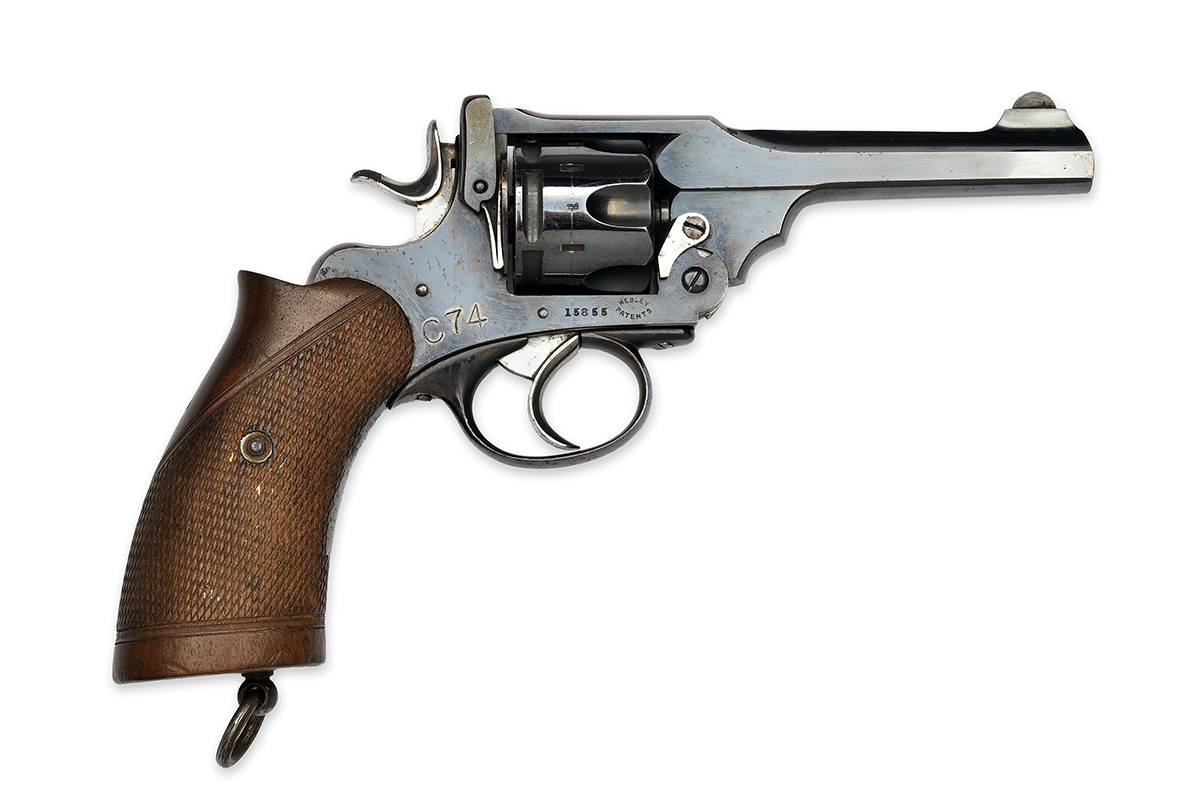 circa 1914, with blued 4in. barrel, crescent fore-sight, break-open frame with automatic ejecting fluted quick-release cylinder, stirrup barrel-latch, the right side of frame stamped with a large 'C74' (believed a bank identification mark), double action mechanism and chequered walnut over-coat sized grip with lanyard ring at heel, much original finish remaining