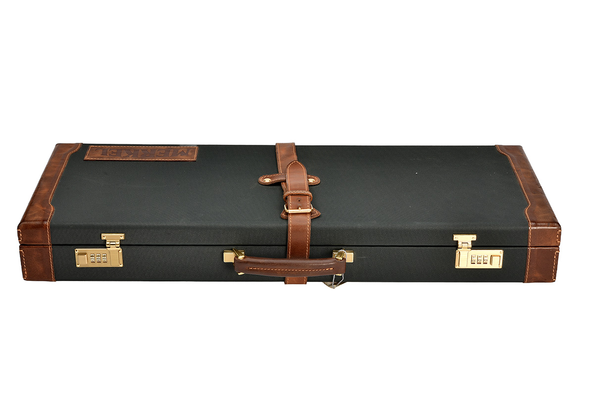EMMEBI, MERKEL A VIRTUALLY UNUSED GREEN CANVAS AND BROWN LEATHER SINGLE RIFLE CASE,