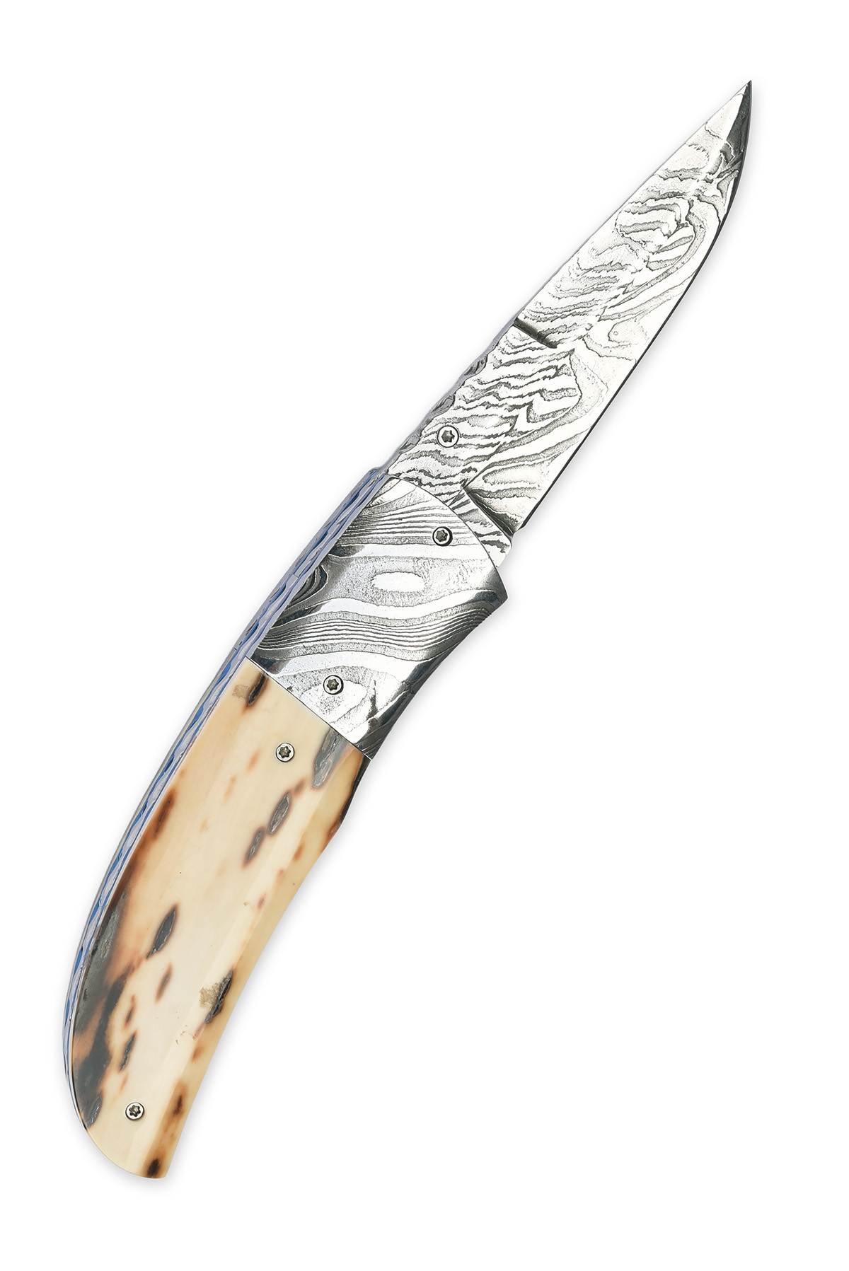 made in 2007 with a 2 1/2in. bark-damascus blade, the blank formed by Mattias Styrefors, bark damascus bolsters relief etched, blue titanium liners, fully carved back-strap, the polished scales of fossilised mammoth tooth, unused (slight storage marks), in a soft leather drawstring pouch