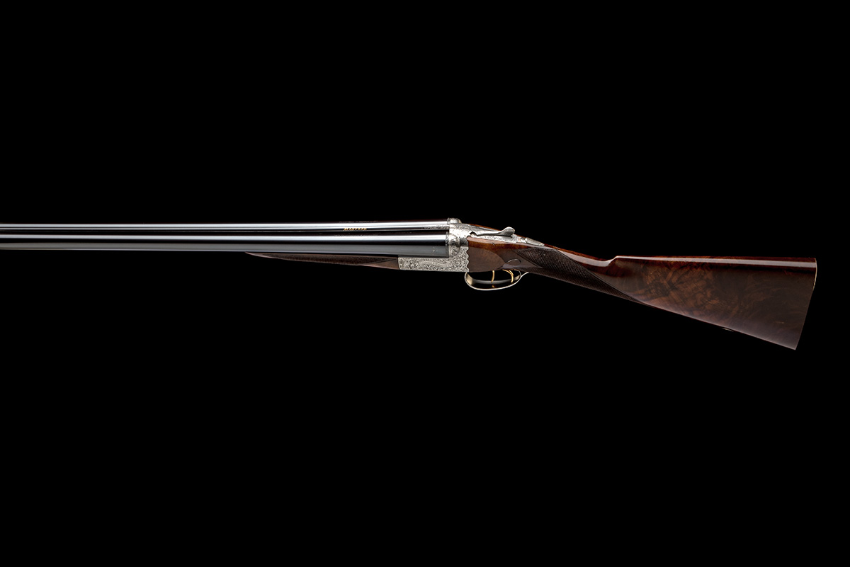 for 1974, 26in. nitro barrels, the rib gold-inlaid in old English style 'Regency', the tubes engraved 'COGSWELL & HARRISON LTD. 168, PICCADILLY. LONDON. W.1.', 2 3/4in. chambers, bored approx. imp. cyl. and 1/2 choke, scroll-back action, automatic safety with gold-inlaid 'SAFE' detail, gold-washed triggers, rolled-edge triggerguard, the whole carved with bold acanthus work, the sides with scrolling banners engraved 'COGSWELL & HARRISON', 14 1/4in. figured stock, weight 6lb. 4oz.