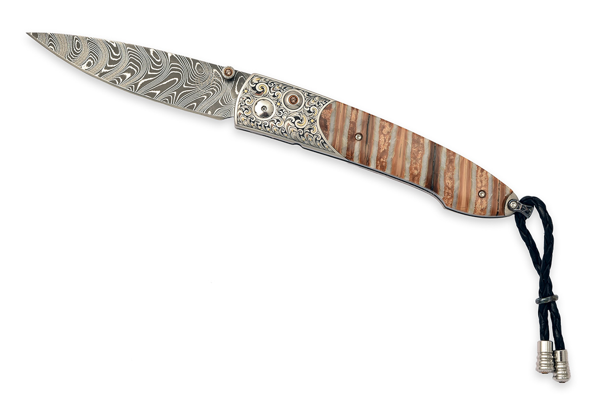 number '2' of a limited edition of '3', with stainless-steel 'boomerang' damascus 2 3/4in. drop-point blade signed on the left side with the subtle 'WH' trademark in a circle surrounded by 'STAINLESS DAMASCUS' and the serial number, engraved thumb-opening assist stud with smoky quartz end-stone, the bolsters with hand engraved scrollwork inlaid with gold and copper accents, engraved thumb-opening lock button further mounted with a smoky quartz end-stone, the scales of fossilised 10,000 year old polished Woolly Mammoth tooth, turned pillar spacers between the bolsters, the heel fitted with a carved and engraved lanyard swivel mounted with a leather lanyard with turned stainless finials, unused in its makers presentation inner and outer boxes with certificate of authenticity dated August 14, 2015 and a signed leather pouch with belt-clip