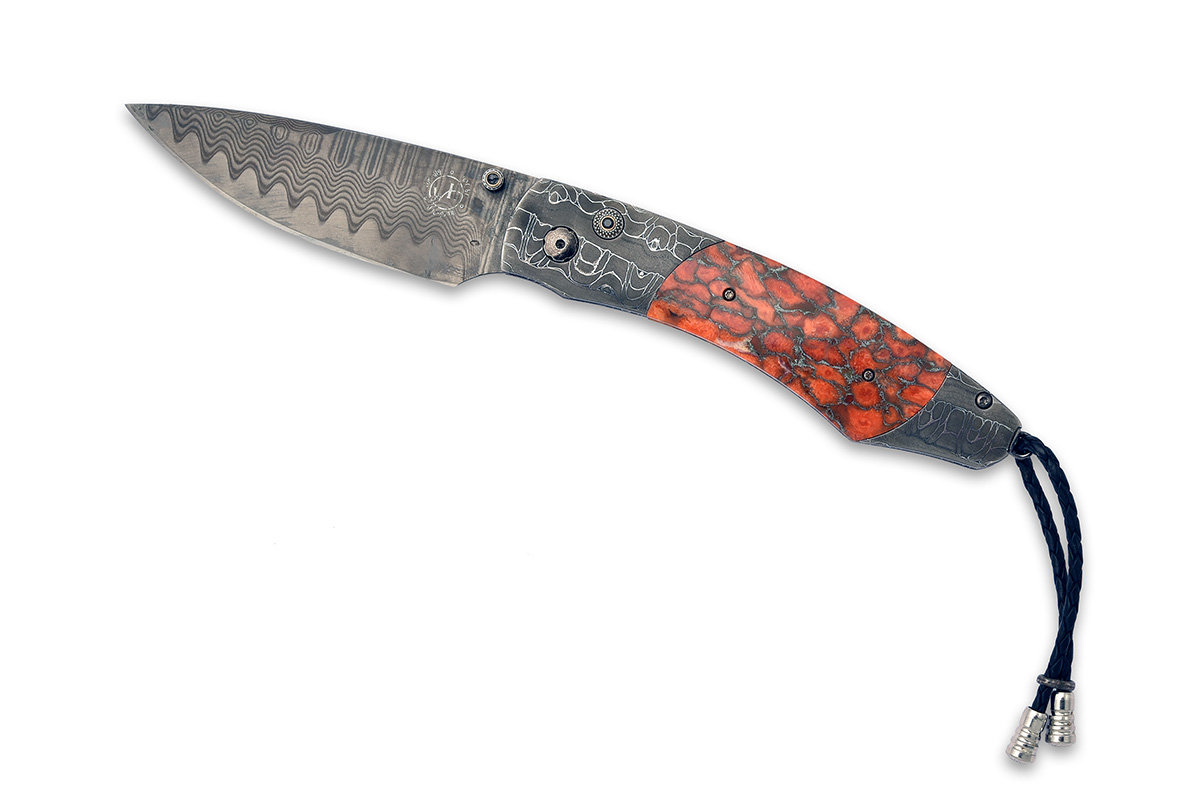 number '43' of a limited edition of '100', with tungsten-coated 'Black Wave' damascus 3in. drop-point blade manufactured with a core of 'ZDP-189' for extra strength and signed on the left side with the subtle 'WH' trademark in a circle surrounded by 'ZDP-189', 'HAC 67' and the serial number, engraved thumb-opening assist stud with spinel gem end-stone, the bolsters of special 'Croc-Skin' damascus by Chad Nichols and with engraved thumb-opening lock button further mounted with a spinel end-stone, the scales of 'zinc matrix' apple coral, turned pillar spacers between the bolsters, the heel fitted with an applied lanyard swivel mounted with a leather lanyard with turned stainless finials, unused in its makers presentation inner and outer boxes with certificate of authenticity dated May 26, 2016, a signed leather pouch with belt-clip and a memory stick containing highlights from the range of William Henry knives and jewellery