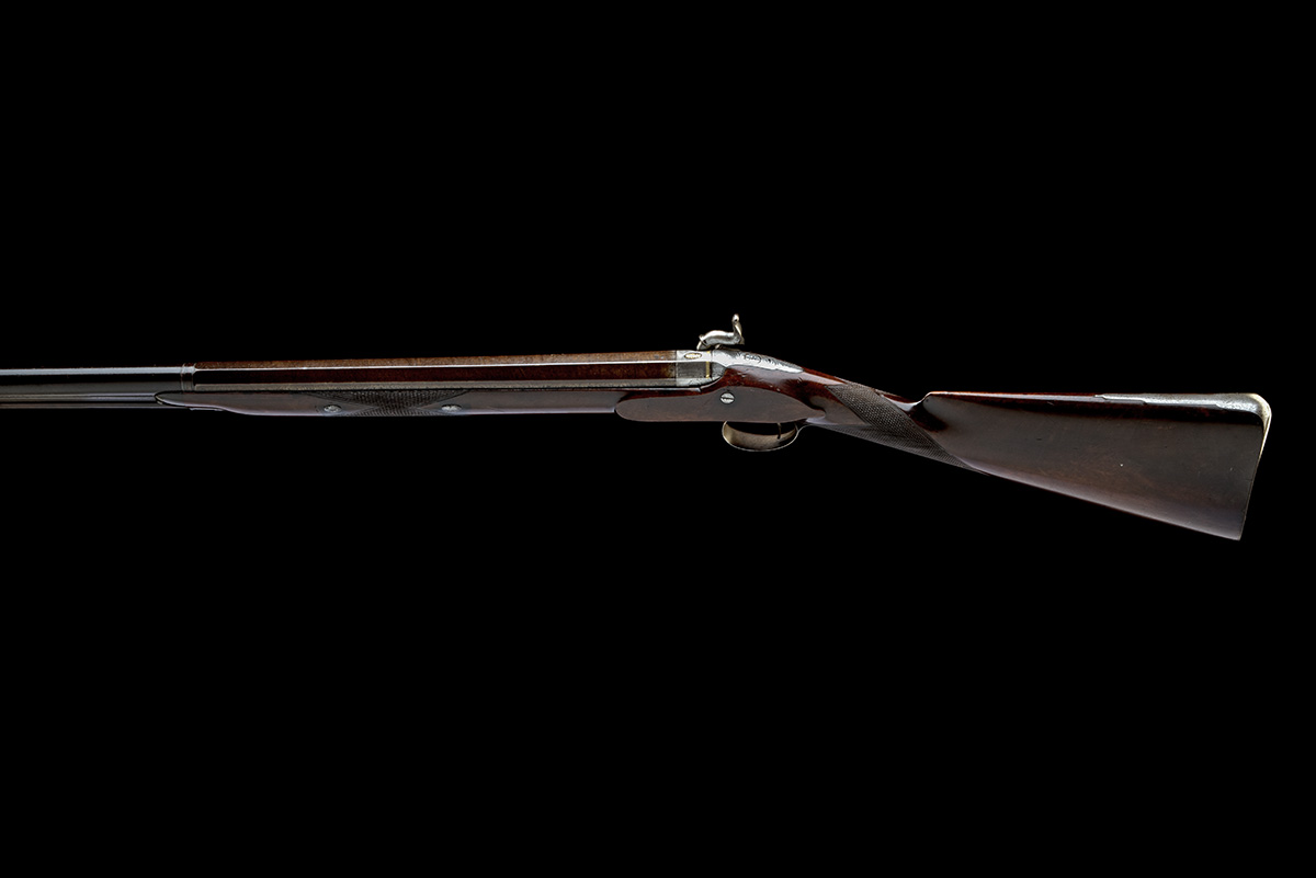 circa 1780, later conversion to percussion from flint, with octagonal to round 40 1/4in. barrel signed within a gold oval poincon at breech 'H. NOCK, LONDON', the underside of barrel bearing the serial number, London proofs and the maker's mark 'HN', the breech-block also marked on the underside 'H.N. PATENT, screwed plug with platinum vent, fully engraved top-tang (detail rubbed), border and feathered scroll engraved flat lock further inhabited by coiled serpents and signed 'JOSEPH MANTON, PATENT' below a dove-tailed inlet where the original pan was, engraved hammer, chequered walnut half-stock, iron furniture, two barrel-keys without escutcheons and brass mounted mahogany ramrod