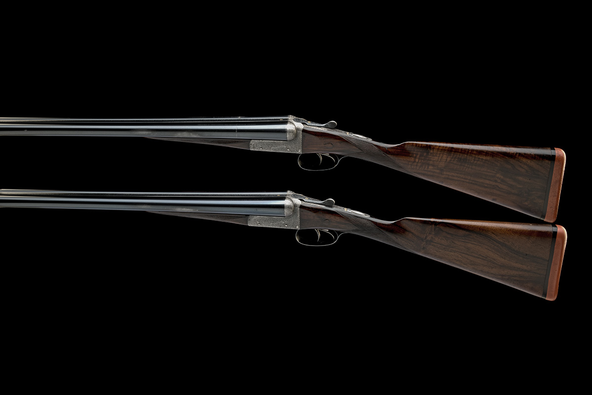 for 1907, No.1 with 30in. nitro reproved barrels (in 1982), wave cut rib gold-inlaid '1' at the breech end, address inscription rubbed, 2 3/4in. chambers, bored approx. 1/4 and 1/2 choke, with later additional 30in. nitro barrels (shared fore-end), wave cut rib gold-inlaid with a star at the breech end, tubes engraved 'E. J. CHURCHILL. GUN & RIFLE MANUFACTURER. 8 AGAR ST. STRAND. LONDON W.C.', 2 1/2in. chambers, bored approx. 1/2 and 3/4 choke, some external stains/pits, No.2 with 29 3/4in. sleeved nitro barrels (by J. Rigby & Co. London in 1987), wave cut rib gold-inlaid '2' at the breech end, the tubes re-engraved 'E. J. CHURCHILL (GUNMAKERS) ORANGE ST. GUNWORKS. LEICESTER SQUARE. LONDON.', 2 3/4in. chambers, bored approx. 1/2 and extra full choke, toplevers gold-inlaid '1' and '2', automatic safeties with gold-inlaid 'SAFE' details, profusely engraved with fine acanthus scrollwork with ornate bordering, the sides of the actions with 'E.J. CHURCHILL' in scrolling banners, the undersides with the 'EJC' roundel, 15 1/4in. figured stocks including 1in. recoil pads, weight No.1 6lb. 11oz. (original) and 6lb. 14oz. (additional), No.2 weight 6lb. 14oz., in their brass-cornered oak and leather case, the additional barrels in a leather barrel case