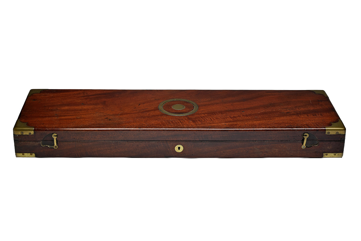 A BRASS-CORNERED OAK SINGLE PERCUSSION GUNCASE,