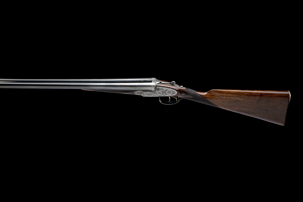 for 1930, 27in. replacement nitro chopperlump barrels, rib engraved 'BARRELS MADE BY J. PURDEY & SONS. AUDLEY HOUSE. SOUTH AUDLEY STREET. LONDON. ENGLAND.' and gold-inlaid '2', 2 3/4in. chambers, bored approx. 1/4 and 1/2 choke, removable striker discs, spring opening action based on the Beesley / Purdey 1880 patent with 1909 model improved ejector, toplever gold-inlaid '2', automatic safety with gold-inlaid 'SAFE' detail, articulated front trigger, fine border and acanthus scroll engraving with floral bouquets, brushed finish, 14 3/4in. stock (escutcheon removed), weight 6lb. 7oz.